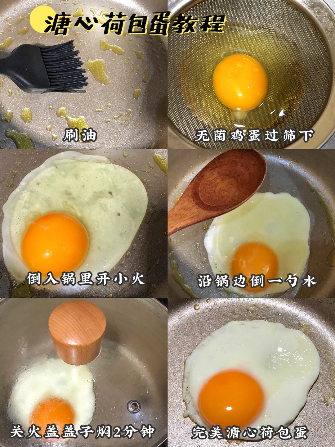 锅里刷薄油,一定要开小火,然后鸡蛋可以用筛子滤一下,这样煎出的蛋形状好看,沿锅边淋入1勺水,关火盖盖子焖2分钟就好啦~