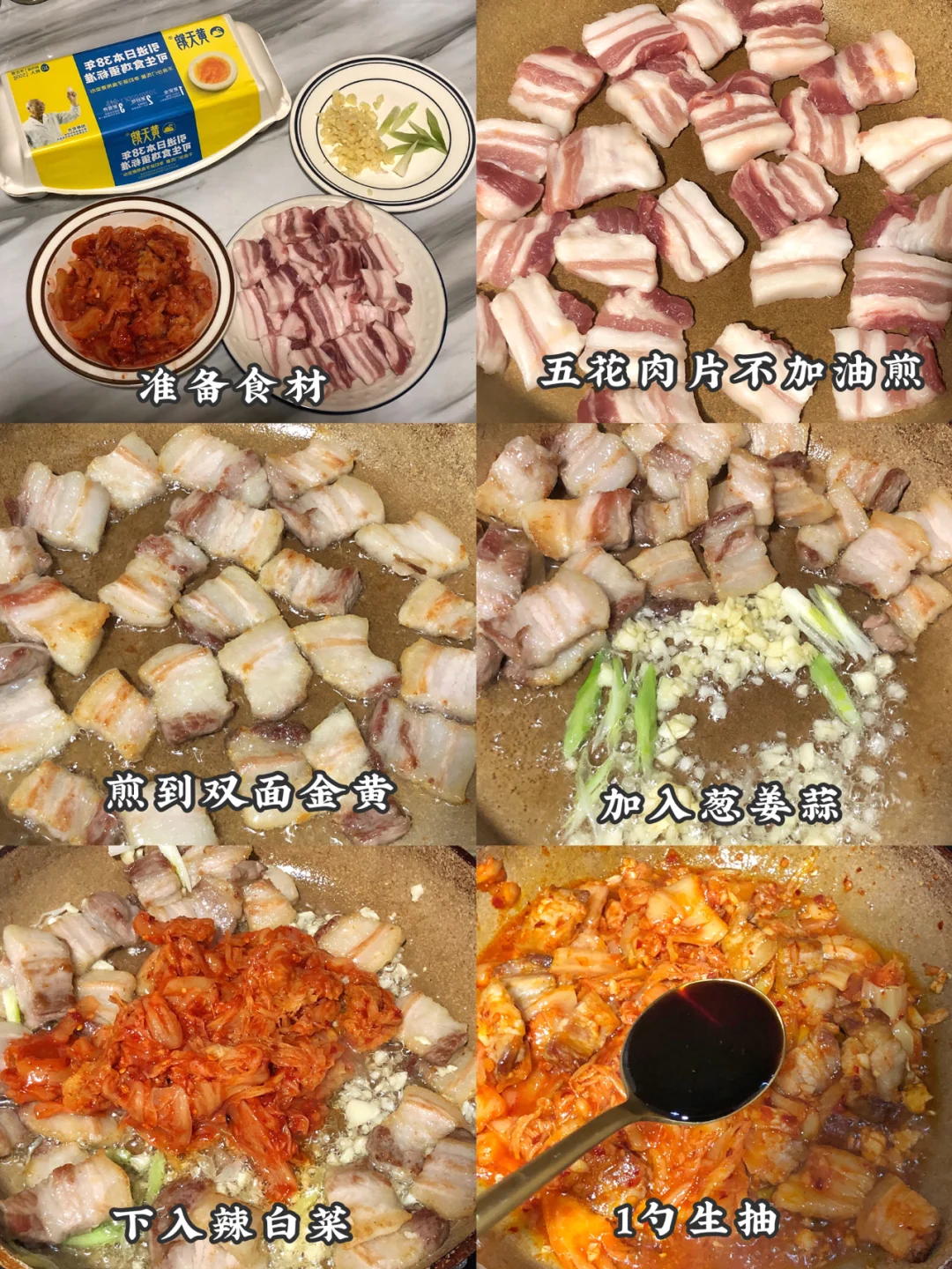 1️⃣锅里不加油煎五花肉,煎到双面金黄出油,然后下入葱姜蒜末翻炒均匀