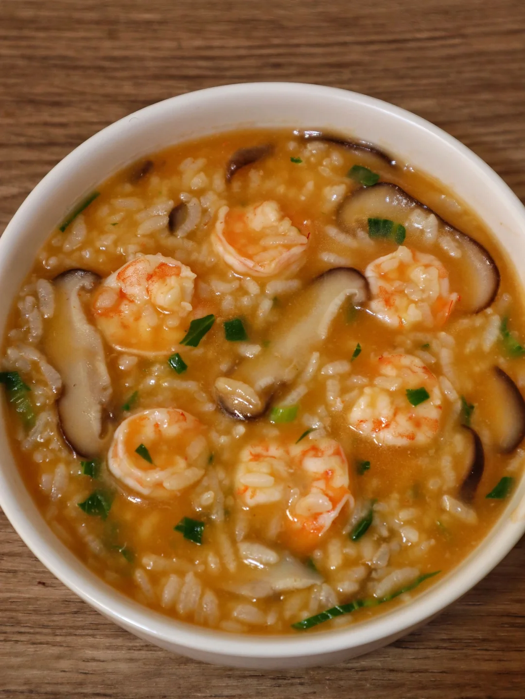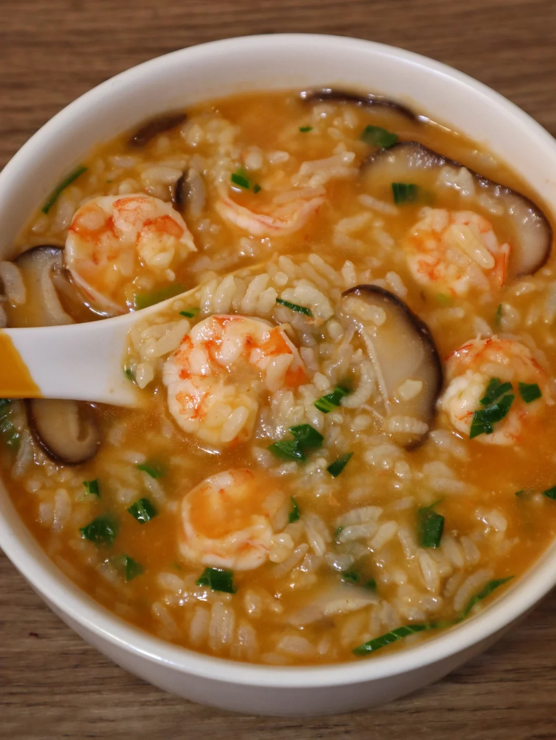 冬天坠幸福的事就是喝一碗暖乎乎的鲜虾粥啦😋喜欢这种偏咸的粥,喝起来超香👍🏻
