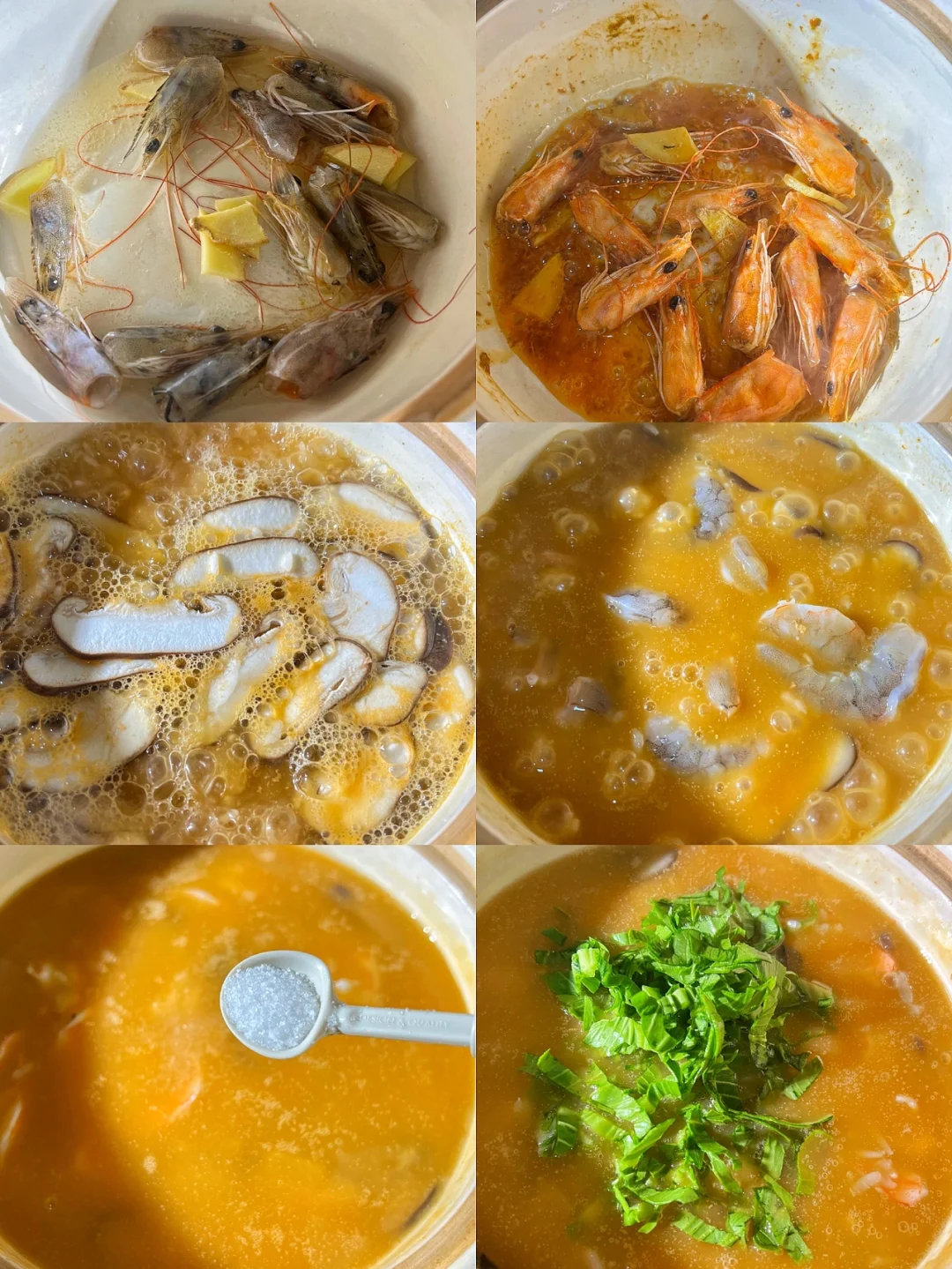 1️⃣锅里热油炒香姜片,然后下入虾头炒出红油,接着倒入热水,水开后捞出虾头和姜片