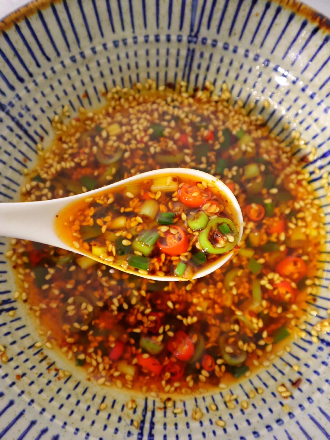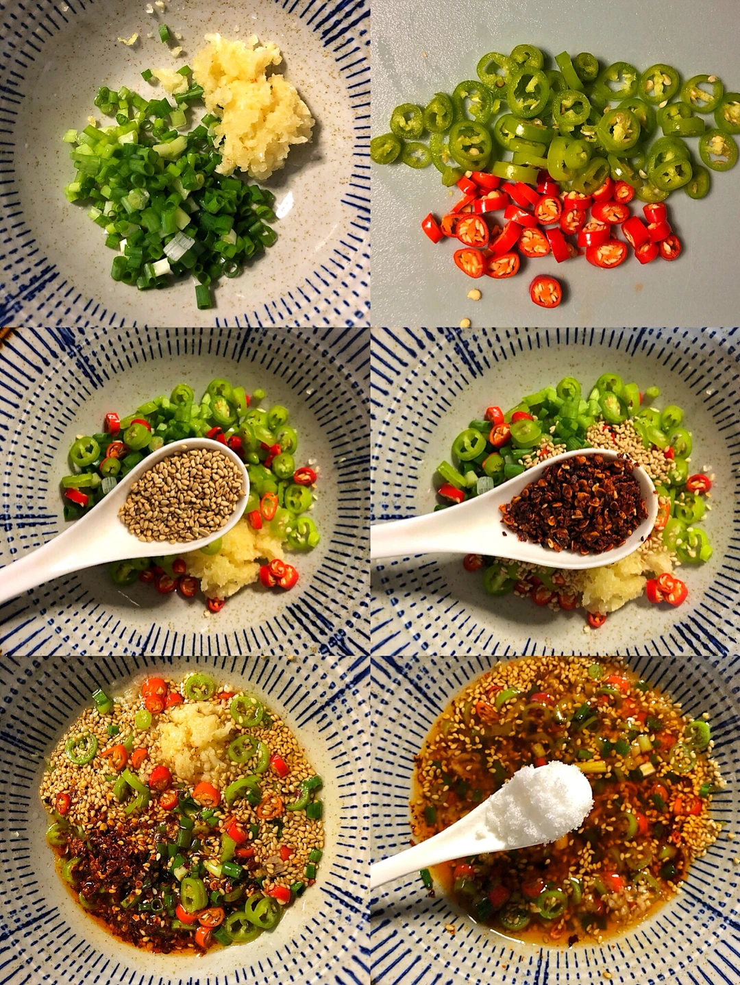 1️⃣准备好葱花和蒜,加入青红辣椒圈,加一勺芝麻,一勺辣椒面,然后淋上两勺热油,搅拌均匀好加一勺白糖,三勺生抽和两勺醋
