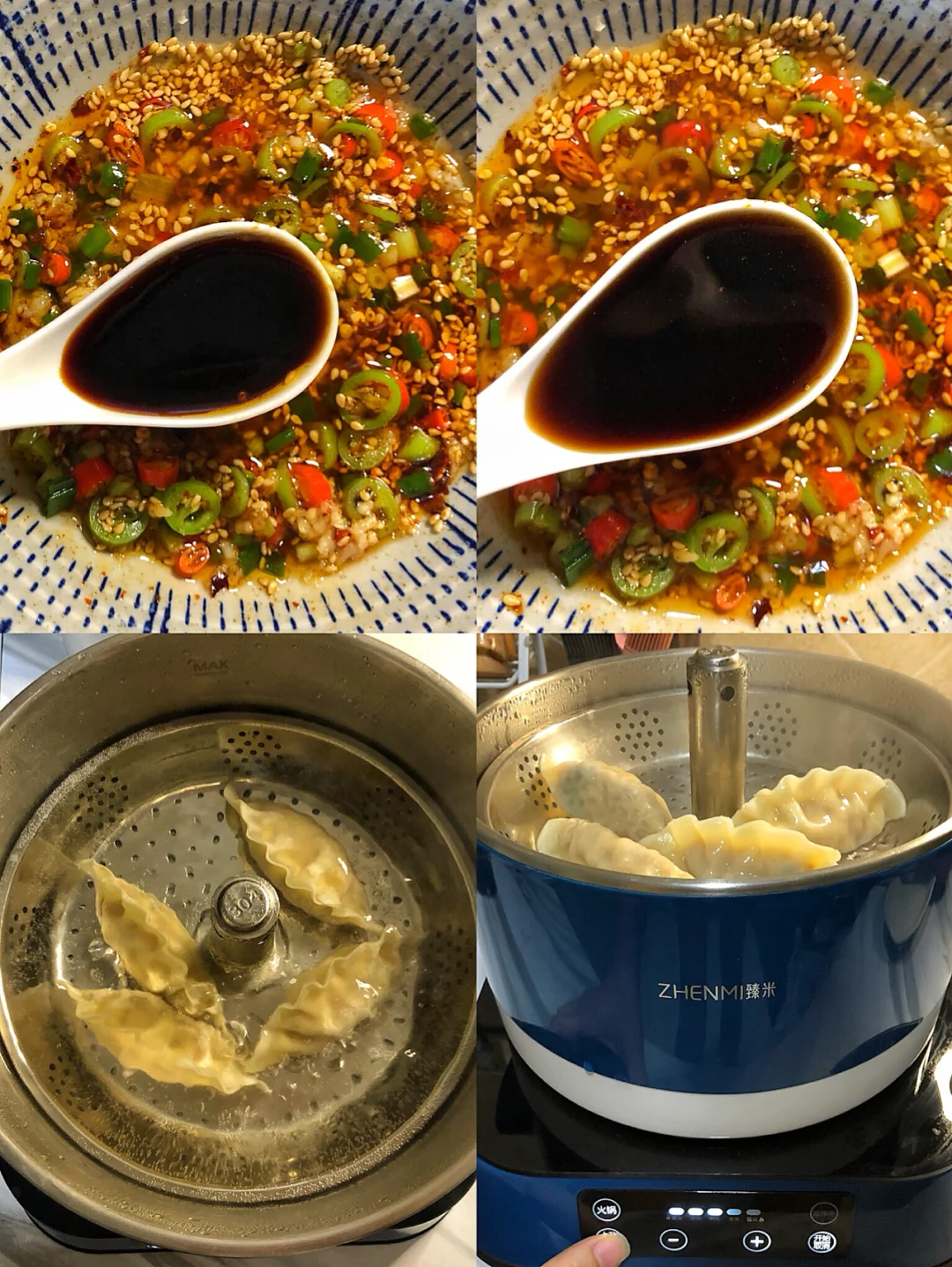 2️⃣我这次用来蘸饺子吃,把饺子放到锅中,水开以后煮五分钟就熟了,然后把饺子捞出~