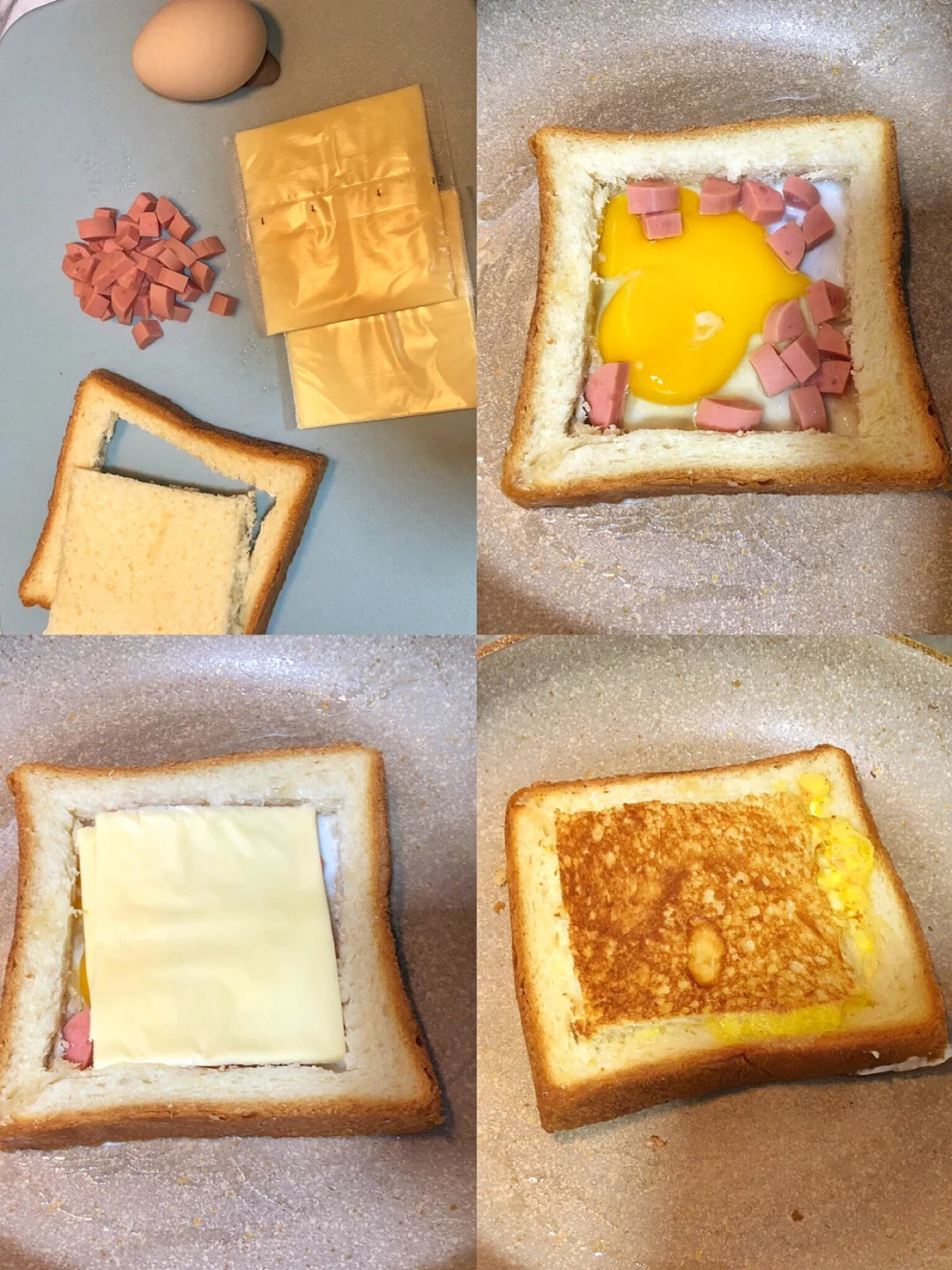 2️⃣锅里热油开小火放入吐司的边边,然后打一颗鸡蛋在吐司边中间,然后加入火腿粒铺上芝士,最后把中间的面包盖上去