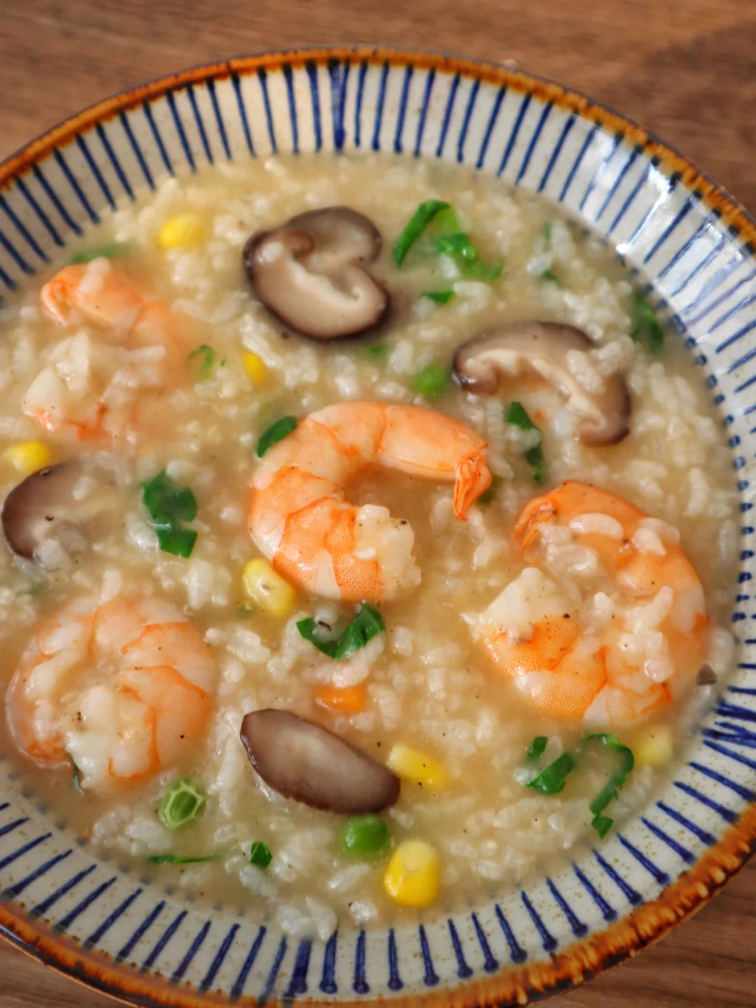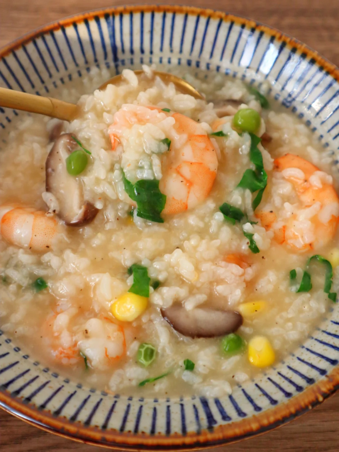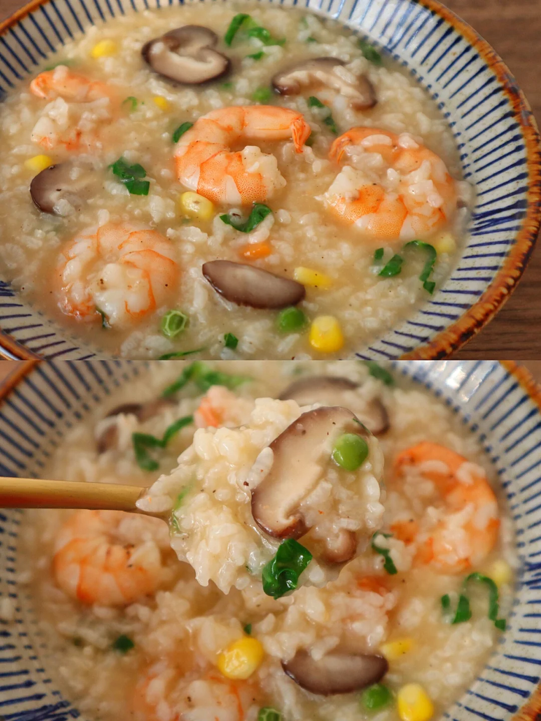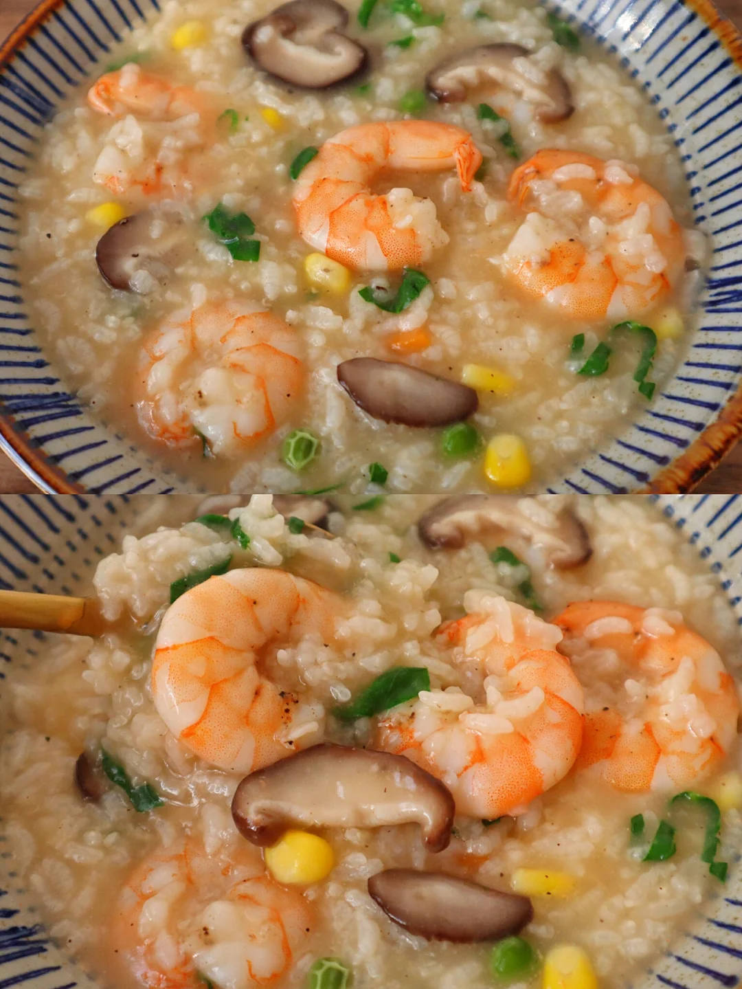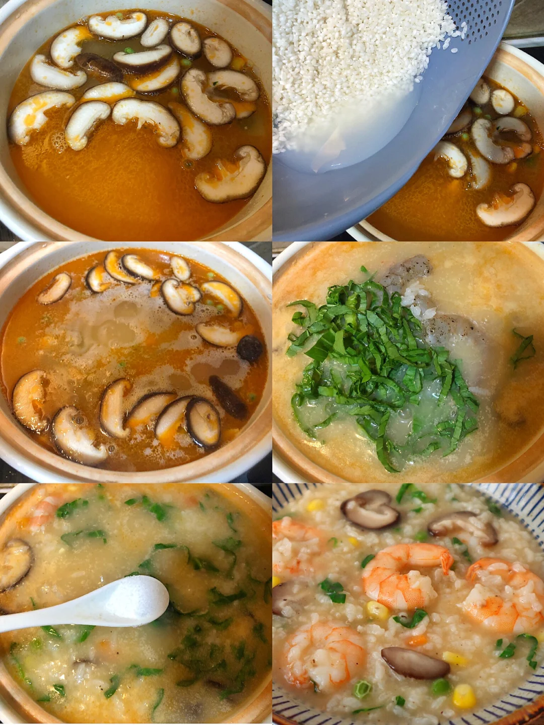 3️⃣加入香菇和时蔬粒,加入提前泡半小时的米,小火煮25分钟,加入青菜和虾仁和2匙盐再煮10分钟就好啦(盐根据自己口味加,先少加一点尝着来哦)