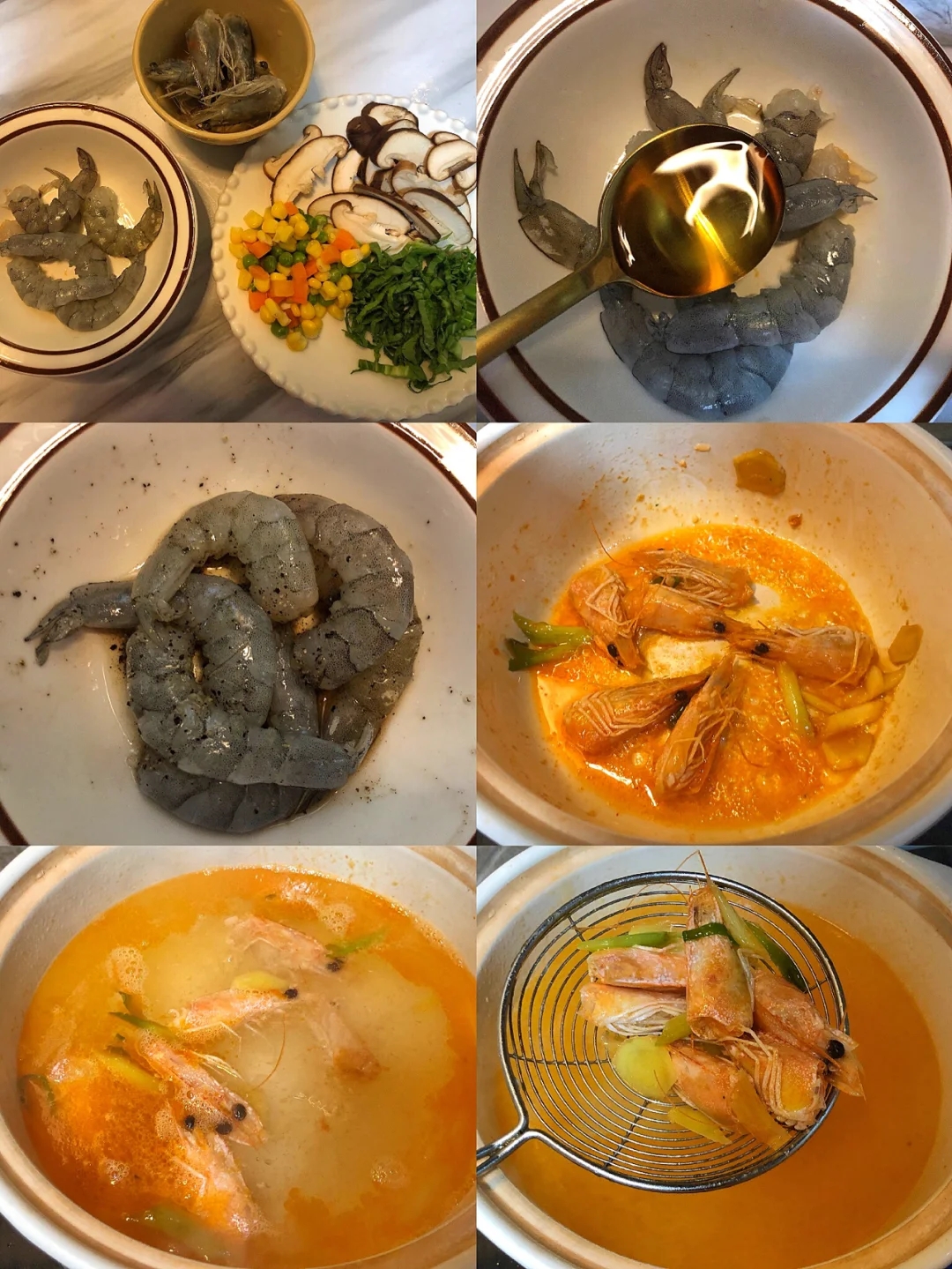 2️⃣砂锅(也可以用煮锅)热油加葱姜,加入虾头翻炒出红油,加入热水,水开后捞出虾头和葱姜