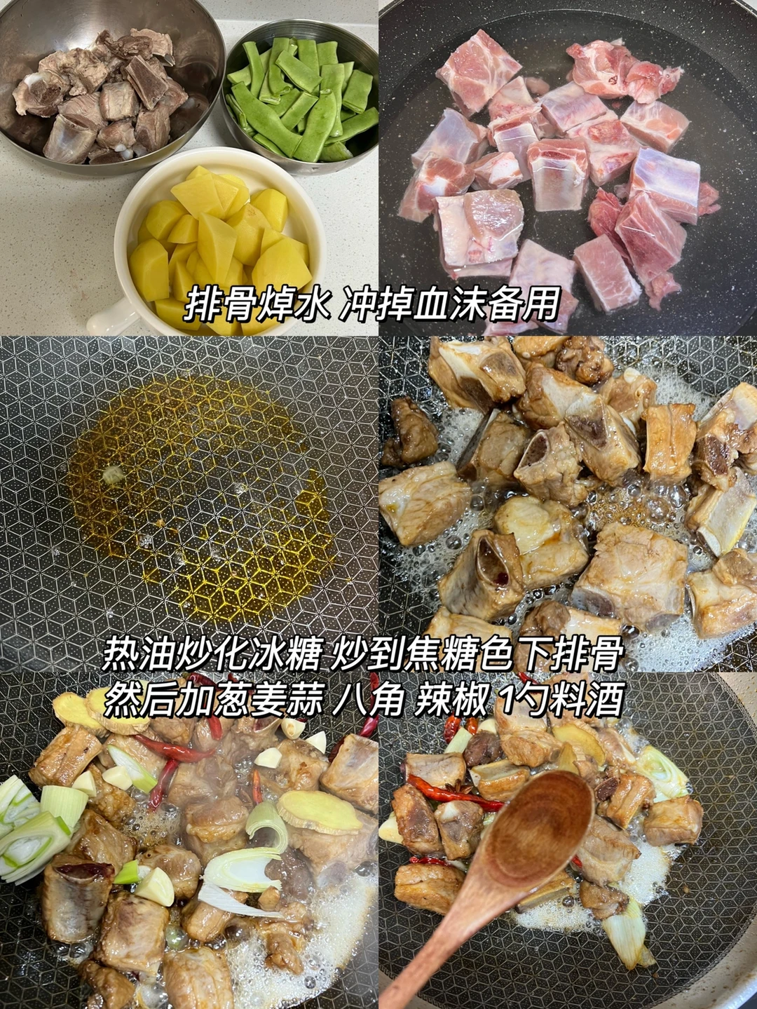 2️⃣锅里热油加入冰糖,小火炒化,炒成焦糖色,下入排骨翻炒均匀,然后加入葱姜蒜干辣椒和八角