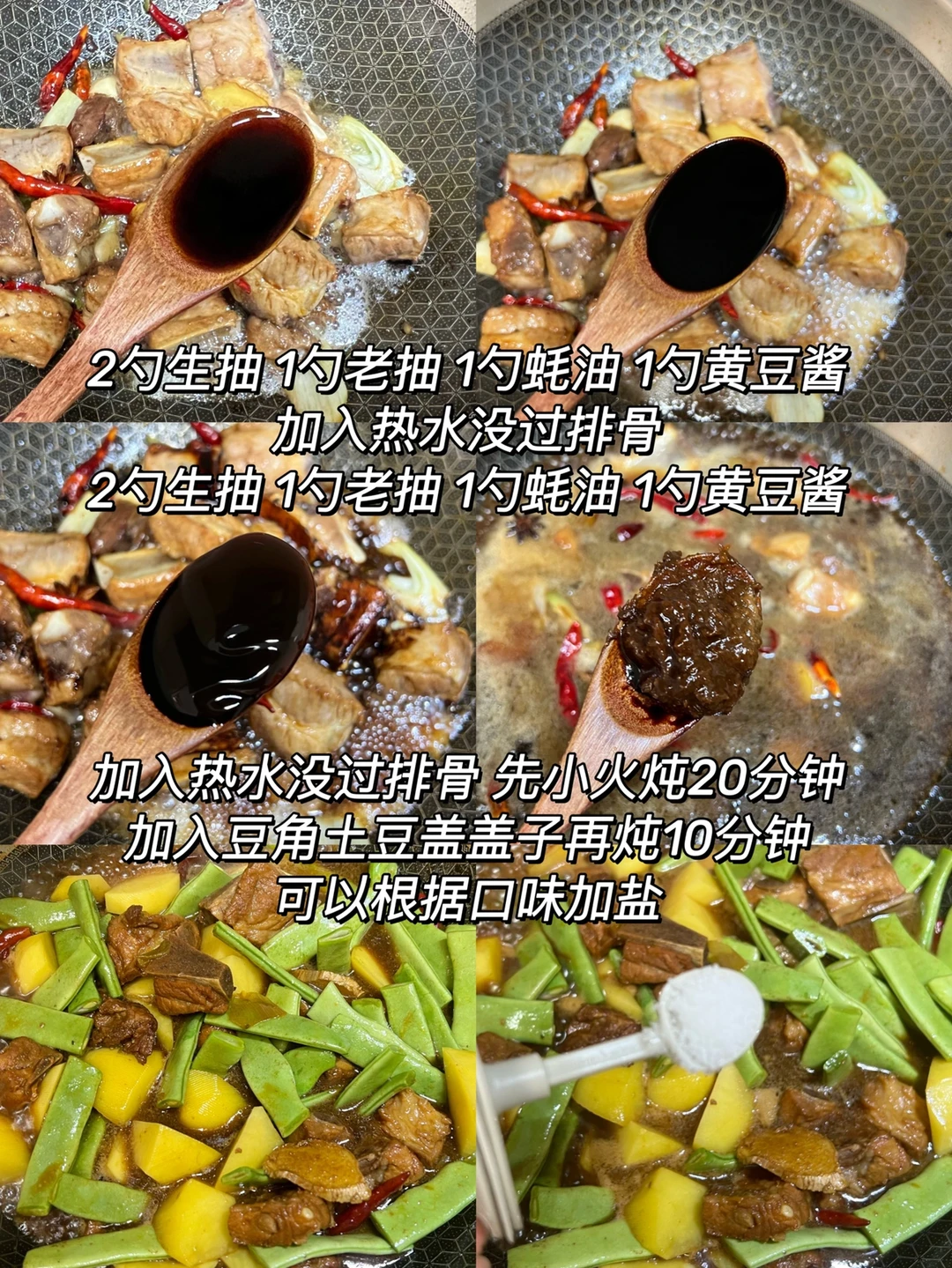 3️⃣加入一勺料酒,两勺生抽,一勺老抽,一勺耗油调味,然后倒热水没过排骨,中小火炖20分钟,然后加入豆角和土豆,根据口味加入盐,再盖盖子中小火炖十分钟,最后简单收汁就可以了
