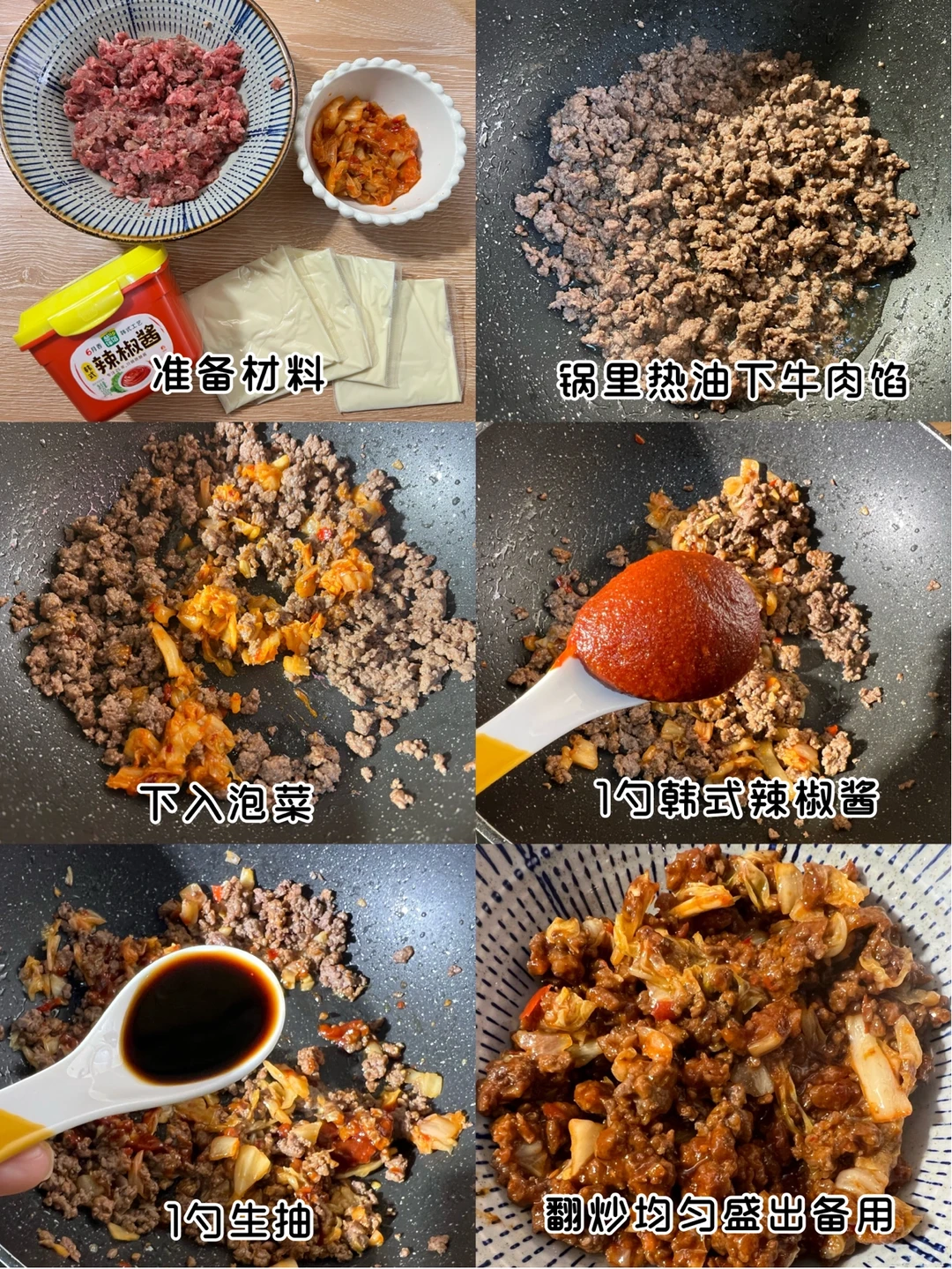 2.馅料:牛肉碎下锅翻炒出水分到变干,然后加入泡菜1勺生抽和1勺韩式辣椒酱翻炒均匀备用
