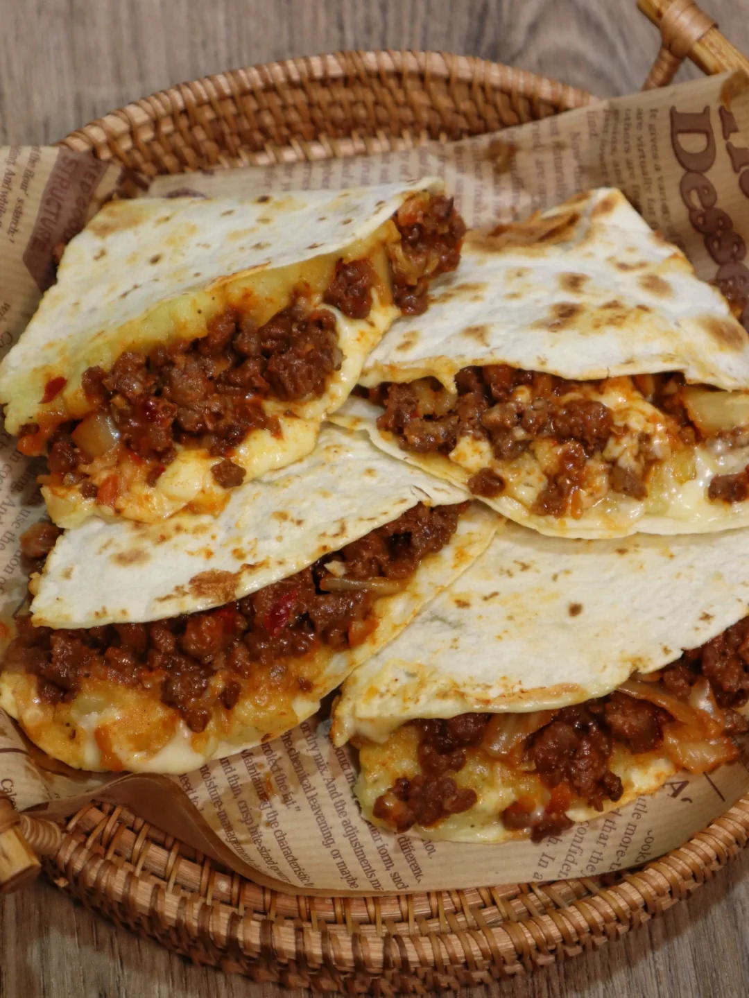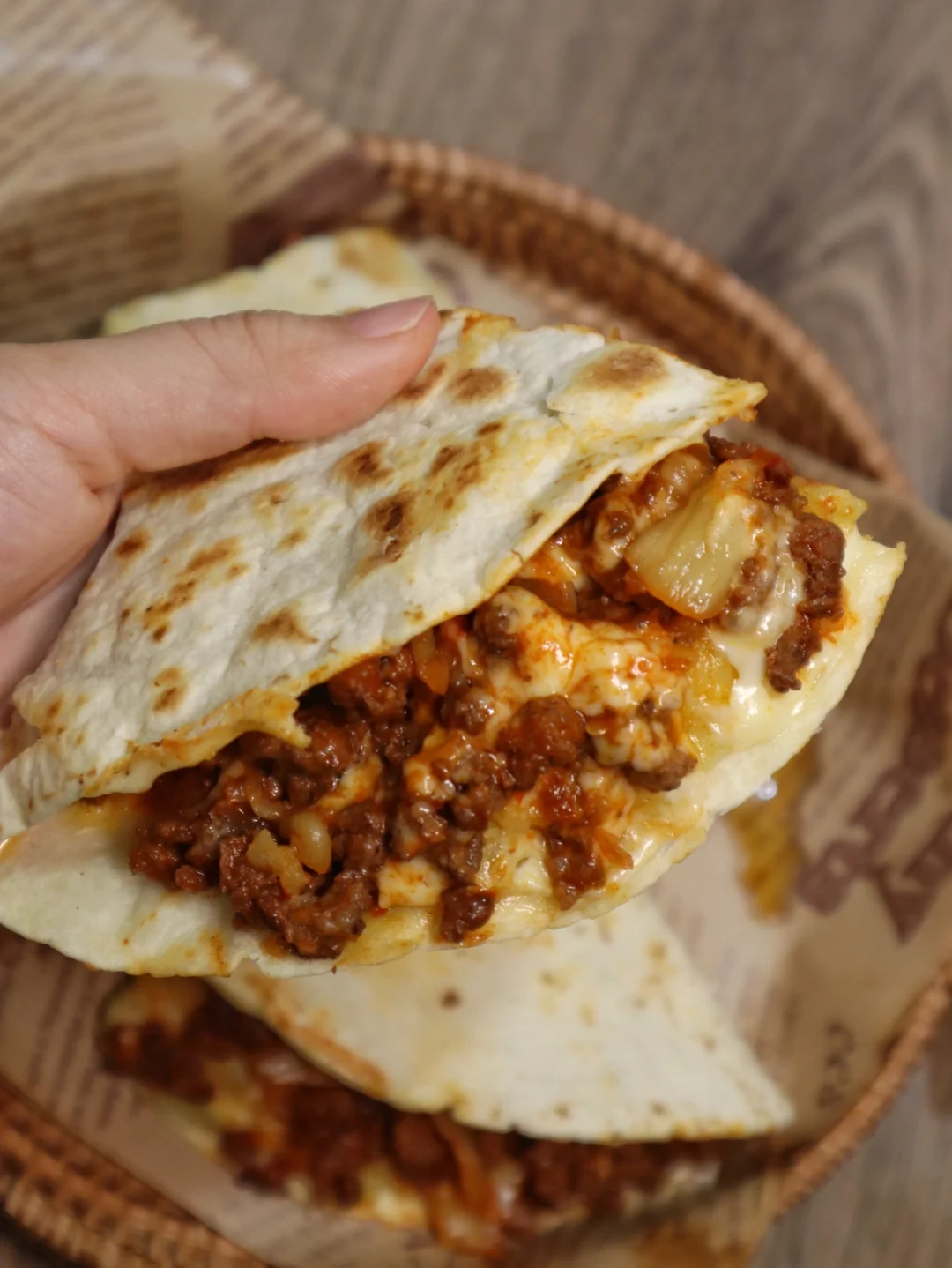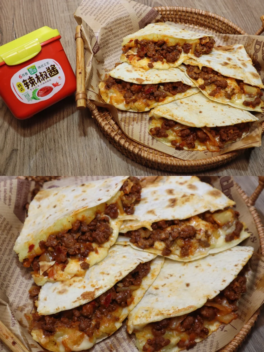 卷饼2张 土豆一颗 牛肉碎200g 泡菜100g 葱伴侣韩式辣椒酱1勺 芝士片4片