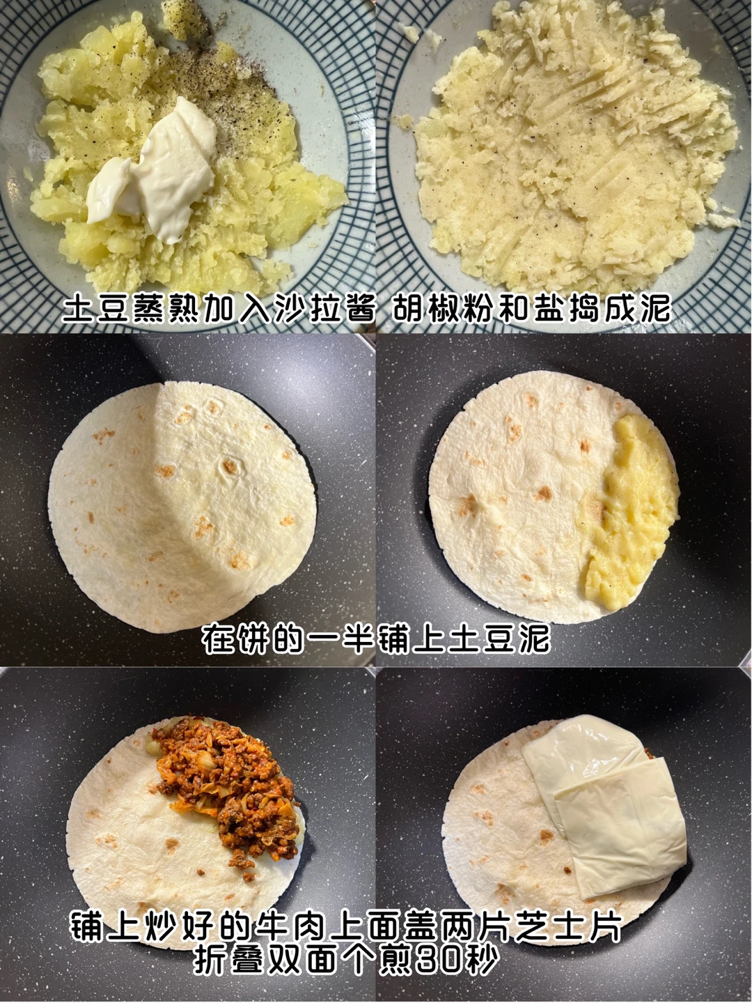 3.把卷饼铺在平底锅上,在卷饼的1/2的位置依次铺上土豆泥 肉馅 2片芝士片