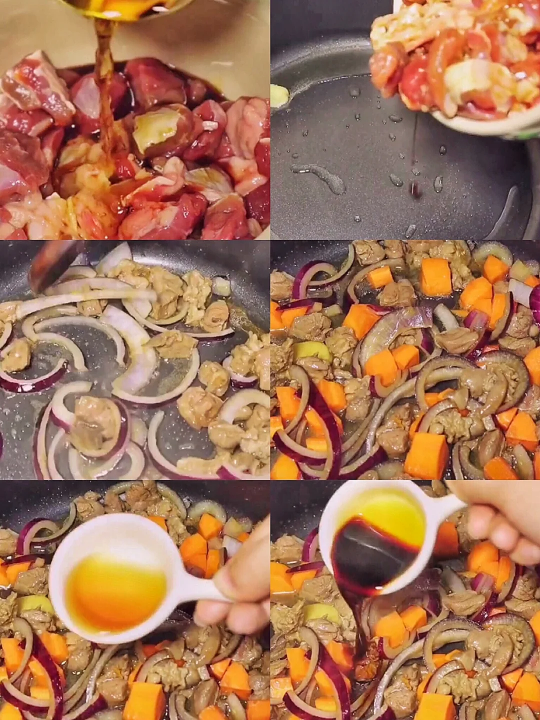 2️⃣热锅冷油爆香姜片,加入羊肉翻炒变色加入洋葱,然后加入胡萝卜翻炒,淋入1勺料酒 2勺生抽 1勺蚝油 1勺孜然粉和一匙盐