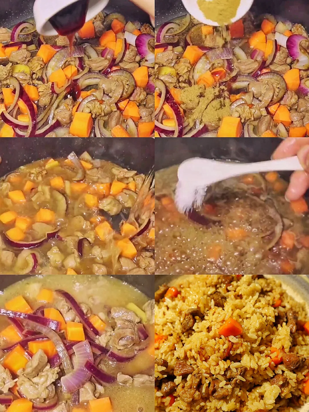 3️⃣加入热水煮开,连汤带肉倒入米饭上,水位和平时做米饭差不多,正常焖煮就好啦