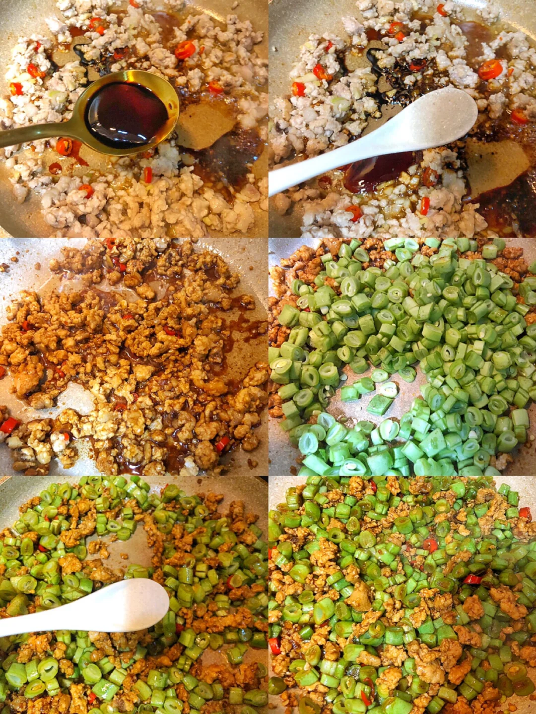 3️⃣加入豆角翻炒5分钟左右,一定要把豆角炒熟哦,加入半匙盐调味~