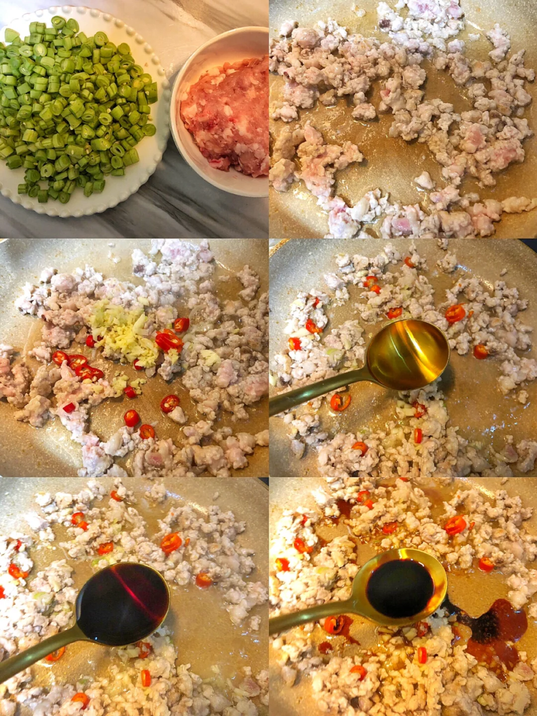 1️⃣豆角去筋切成小段,肉剁成肉糜