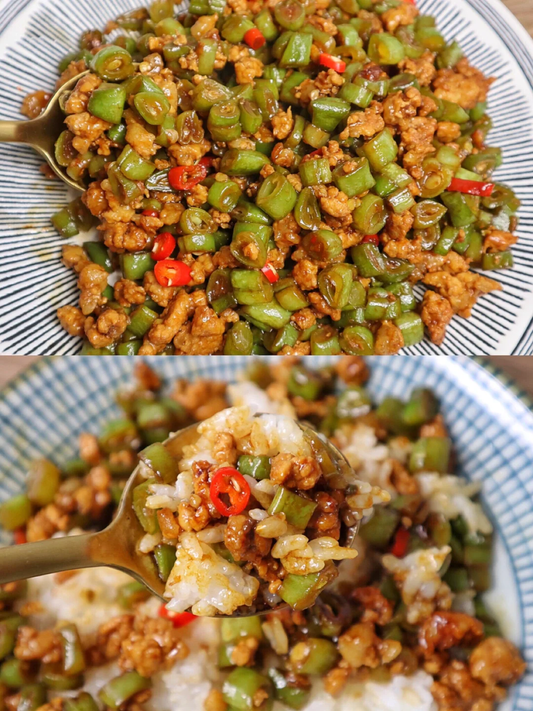 我太喜欢菜拌饭了,这个肉末豆角多炒出来一点,连吃两天也不会腻~