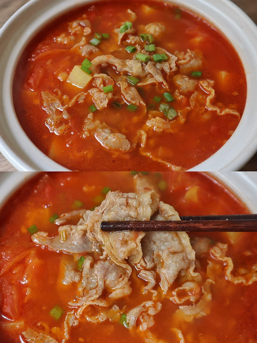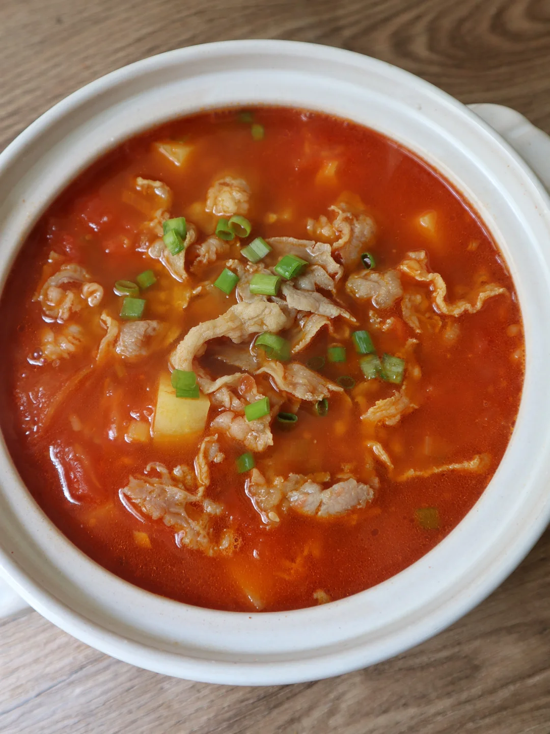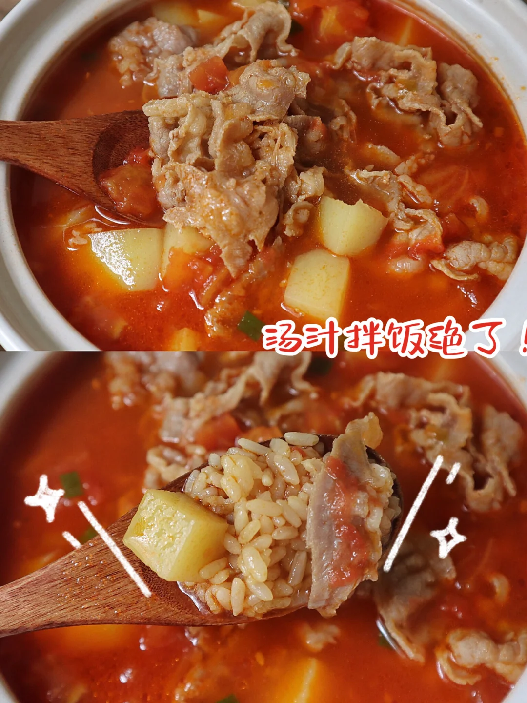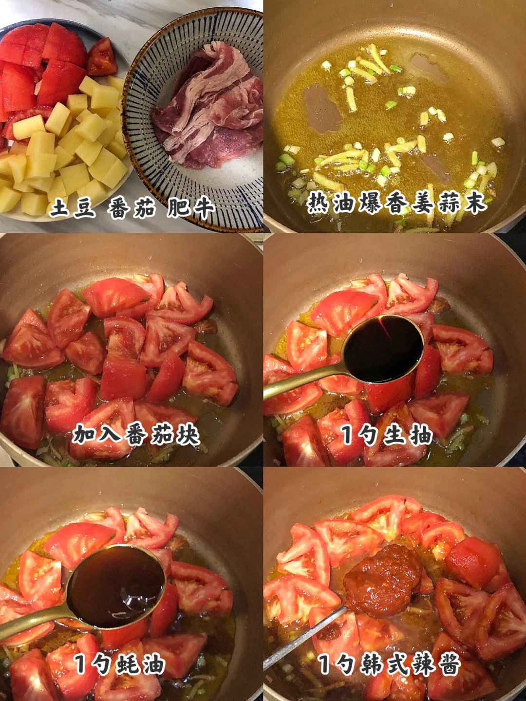 番茄1颗 肥牛300g 土豆1个 葱姜蒜末 韩式辣酱(或番茄酱)