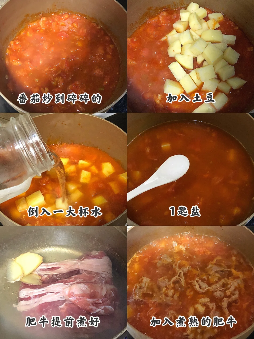 1️⃣番茄去皮切块 土豆去皮切小块 肥牛加料酒姜片煮熟备用