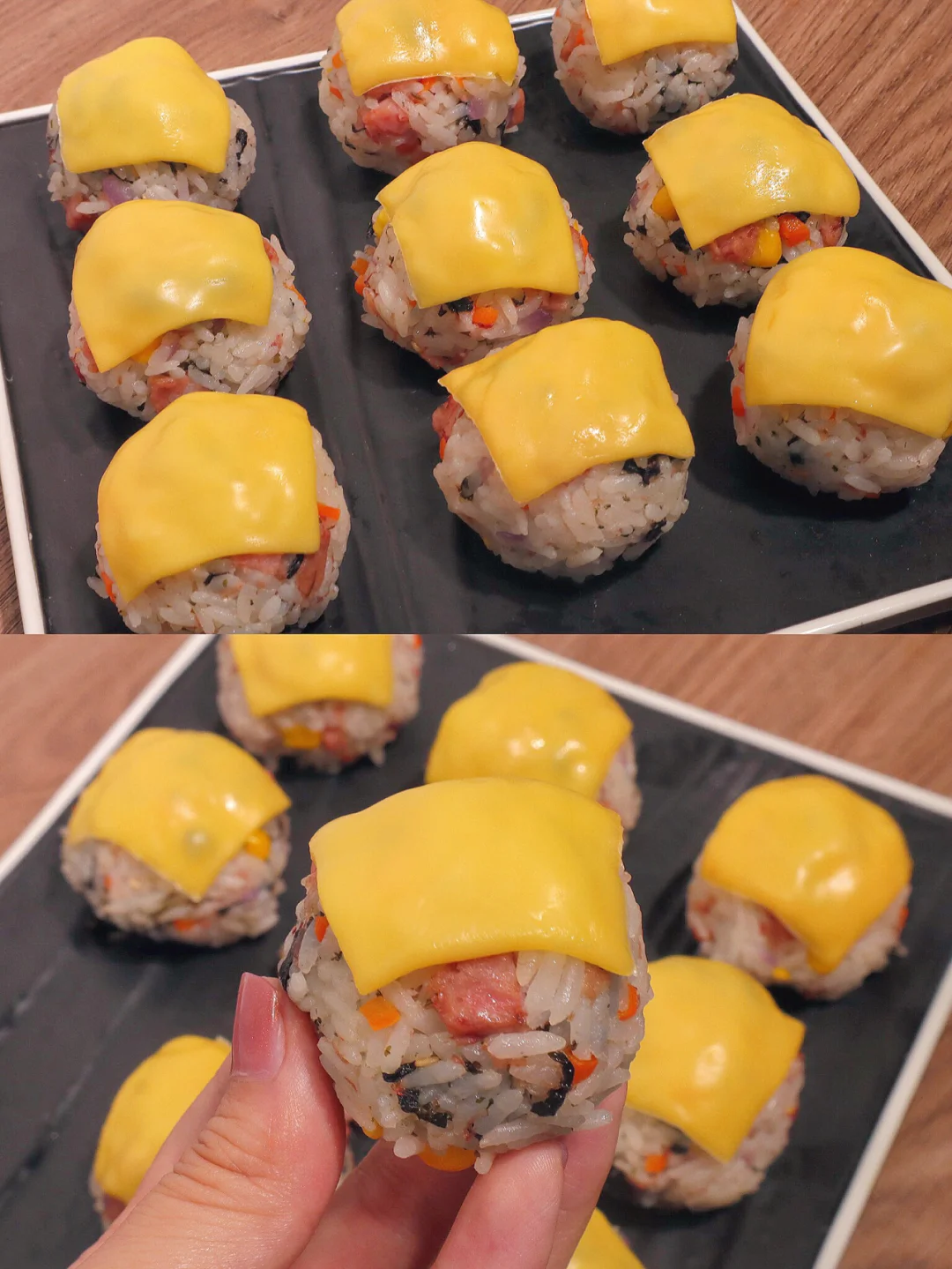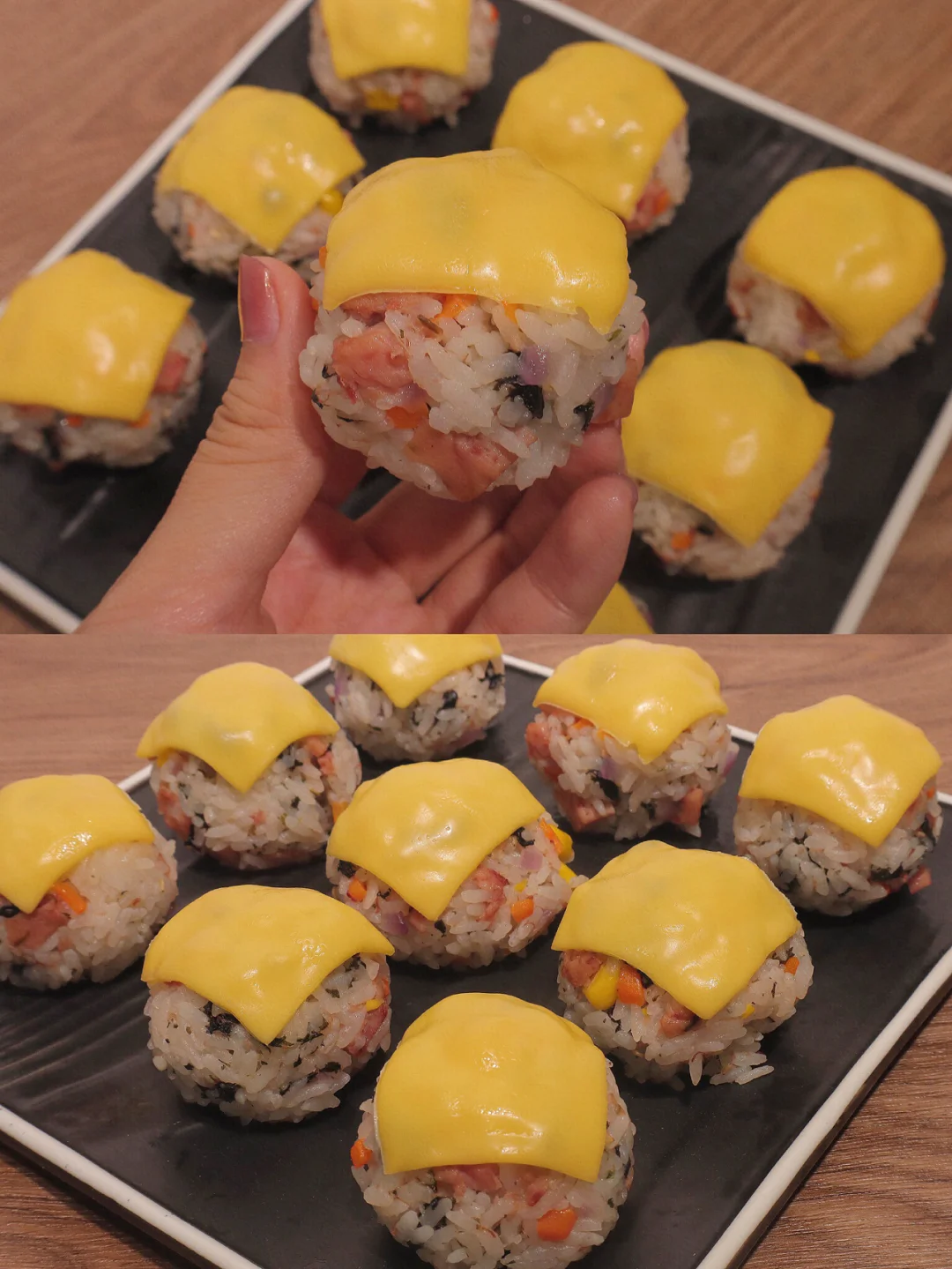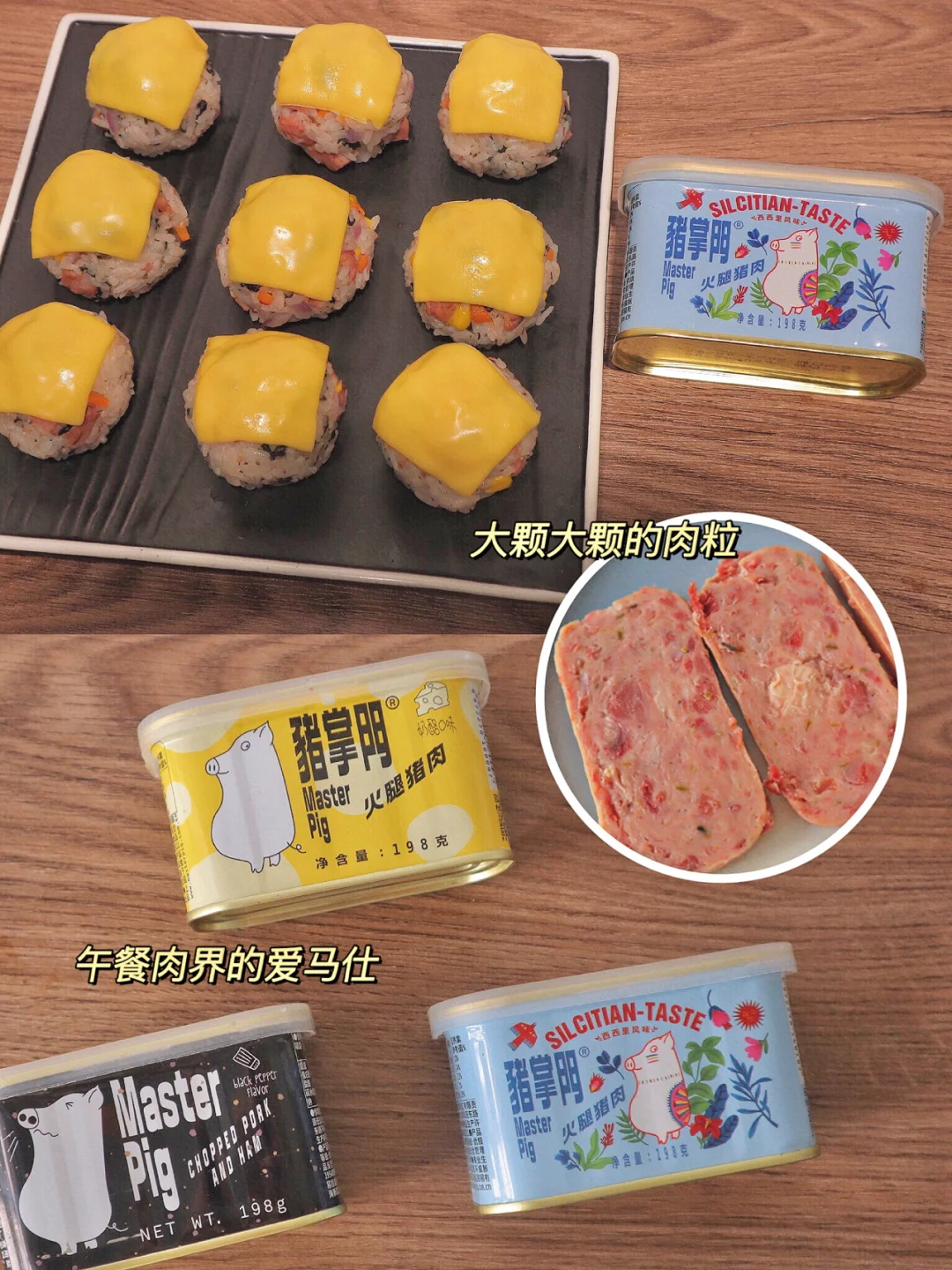 😋芝士和饭团真的是太搭了,奶香奶香的饭团超好吃,里面的肉是扎实的猪肉颗粒,我用的是猪掌门西西里风味的火腿猪肉,比平时吃的午餐肉口感好太多,不是那种淀粉的,全是肉粒粒~爱了爱了~