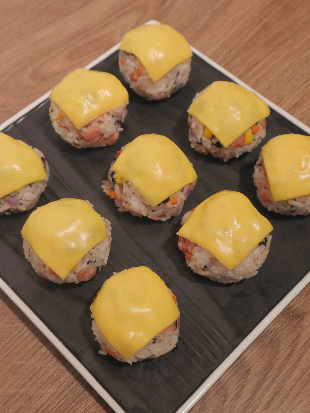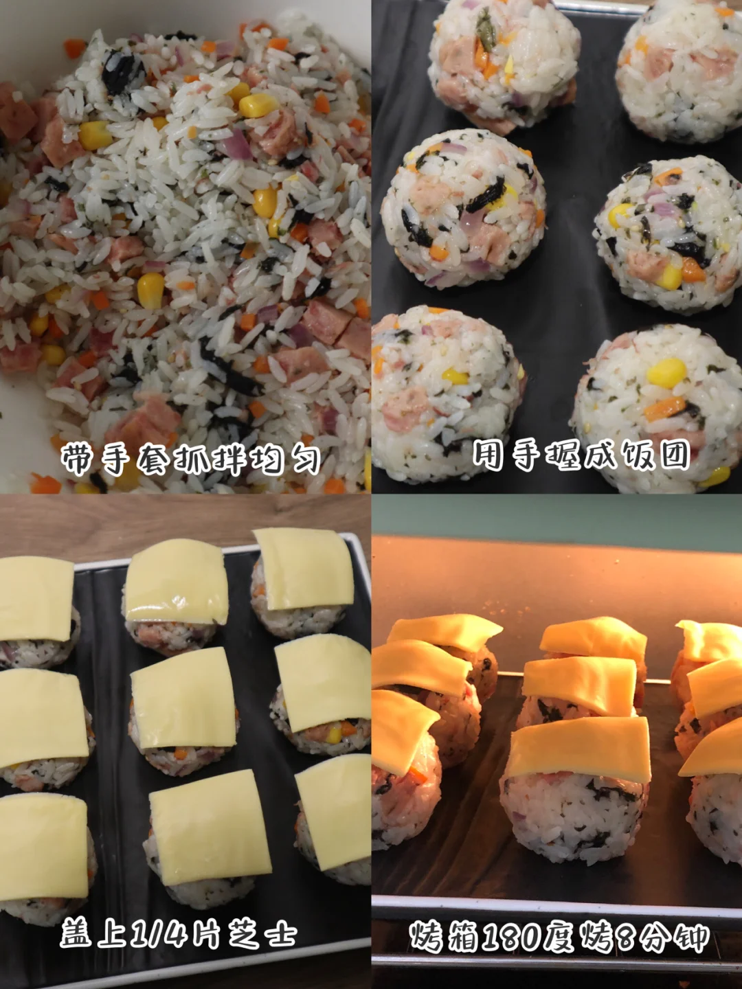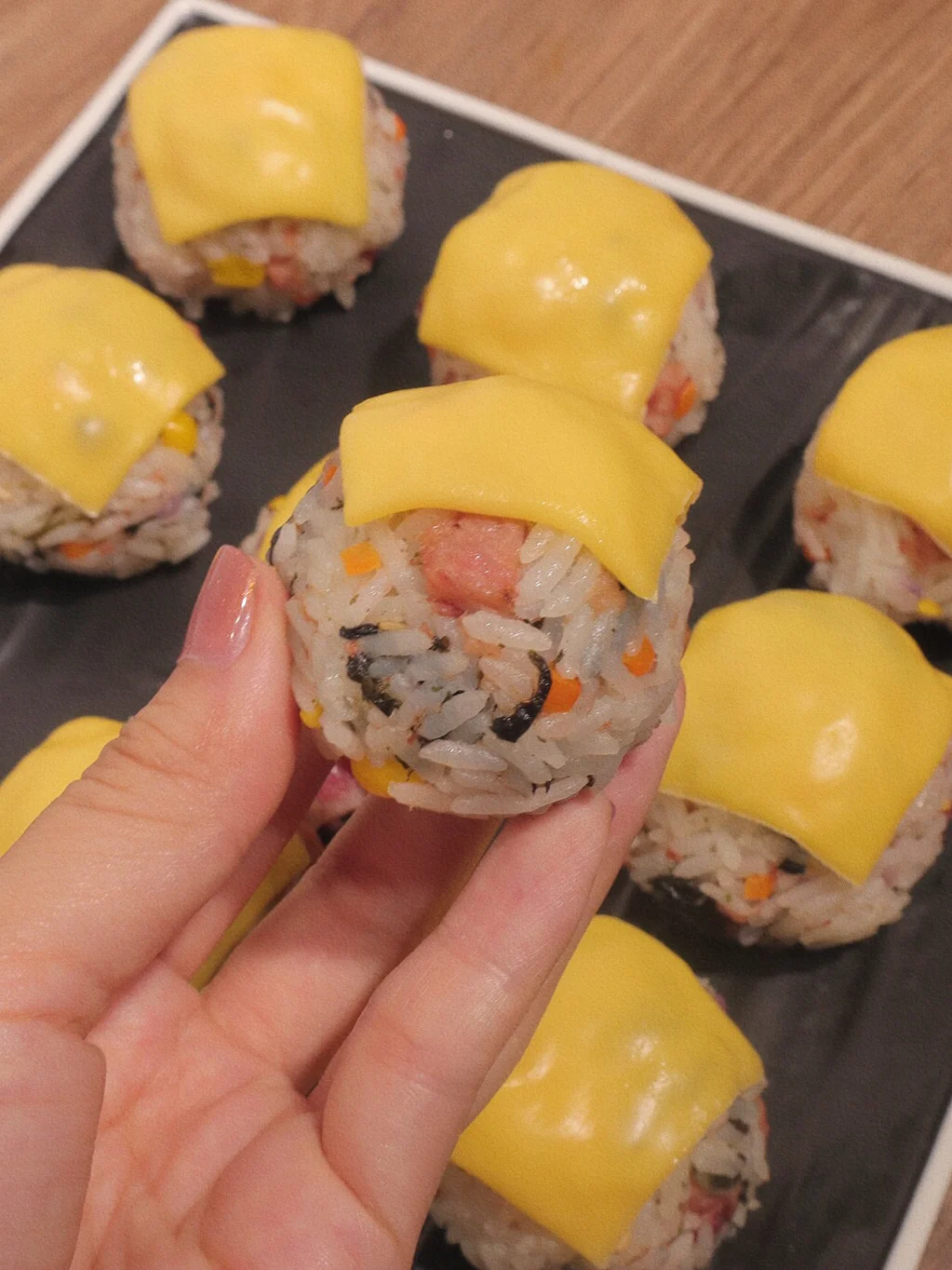 😋芝士和饭团真的是太搭了,奶香奶香的饭团超好吃,里面的肉是扎实的猪肉颗粒,我用的是猪掌门西西里风味的火腿猪肉,比平时吃的午餐肉口感好太多,不是那种淀粉的,全是肉粒粒~爱了爱了~