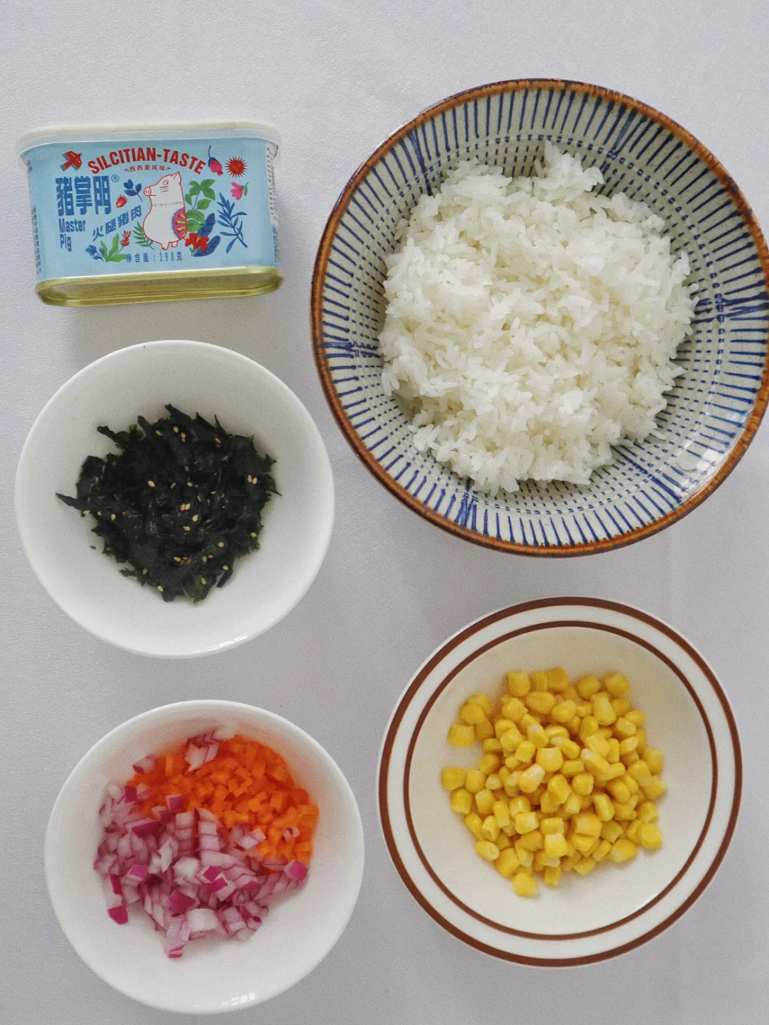 米饭1碗 午餐肉2片切丁胡萝卜碎 玉米粒 洋葱碎 芝士两片(每片剪成四小片)