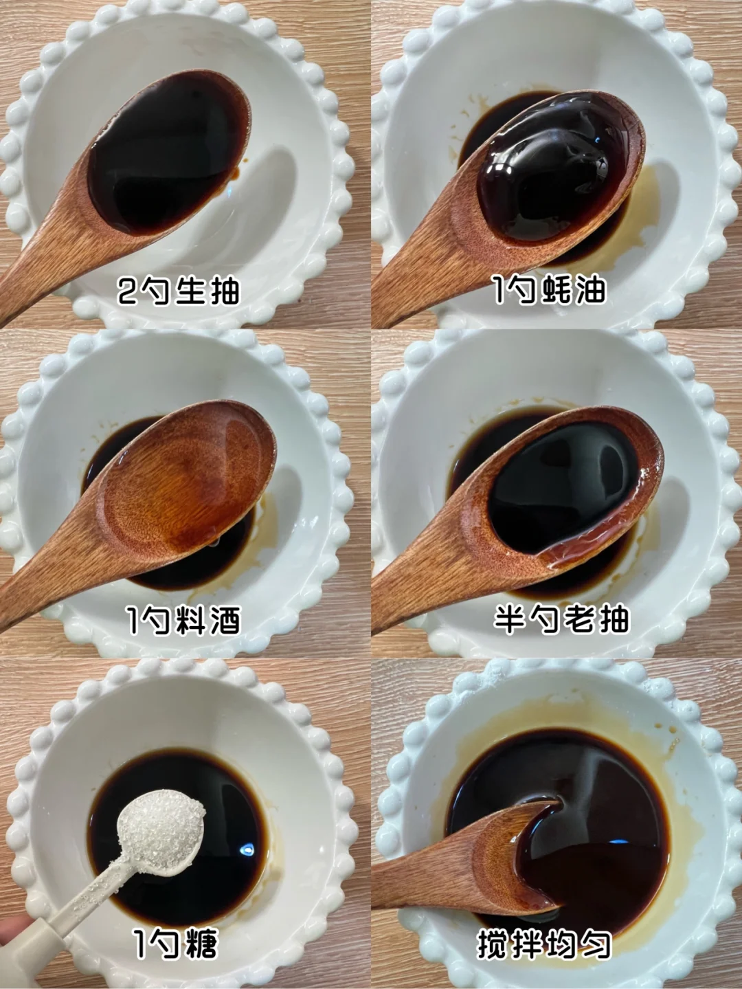 1️⃣先调一个碗汁:2勺生抽 1勺蚝油 1勺料酒 半勺糖,加2勺水搅拌均匀