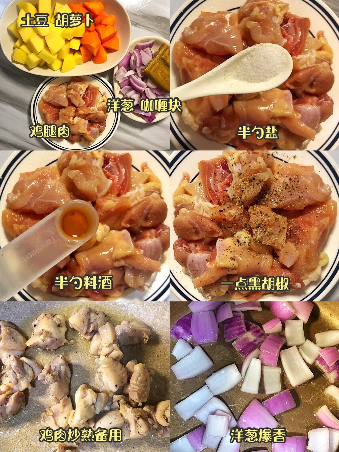 鸡腿肉去骨切成小块,洋葱切成块,胡萝卜和土豆切块