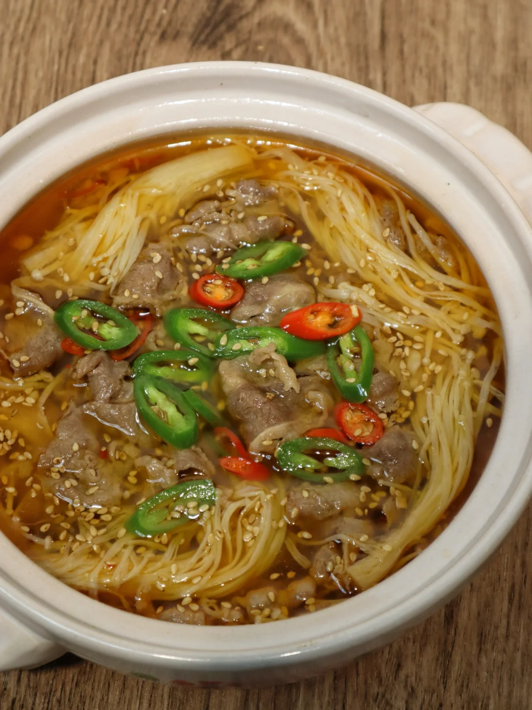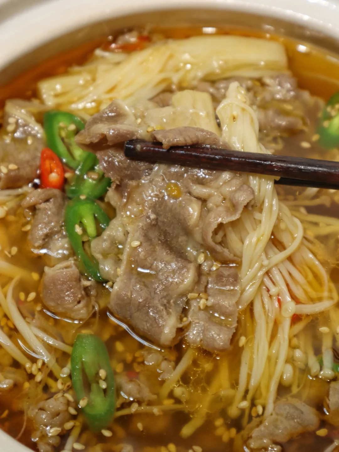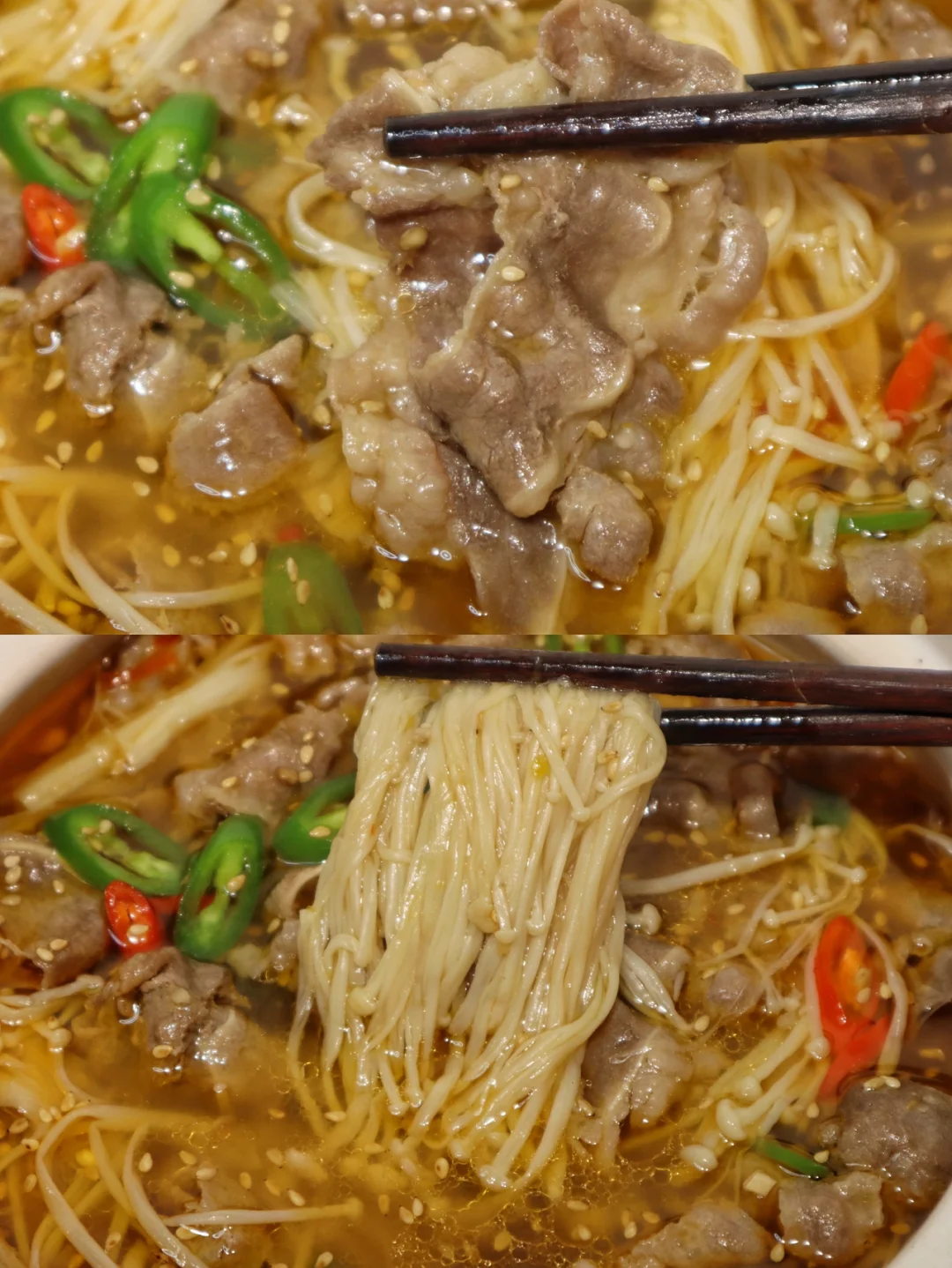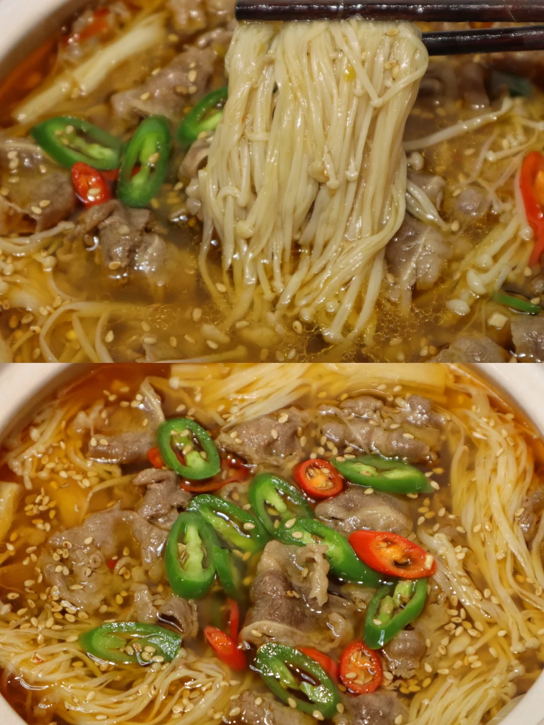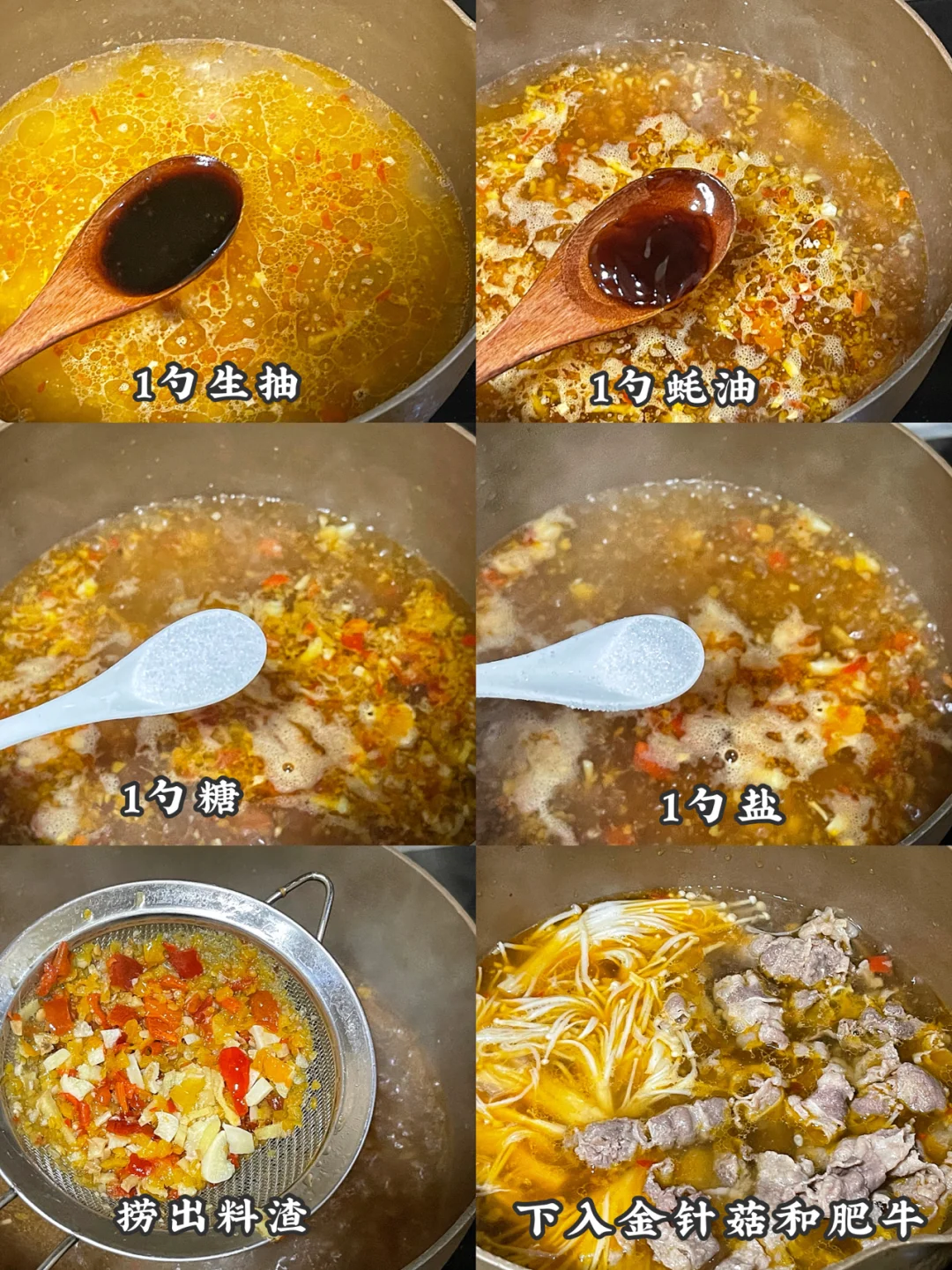 3️⃣加2勺生抽 1勺蚝油 1勺盐 1勺糖和1勺白醋调味,水开后捞出料渣,再下入肥牛和金针菇煮3分钟后连汤带菜一起盛出~