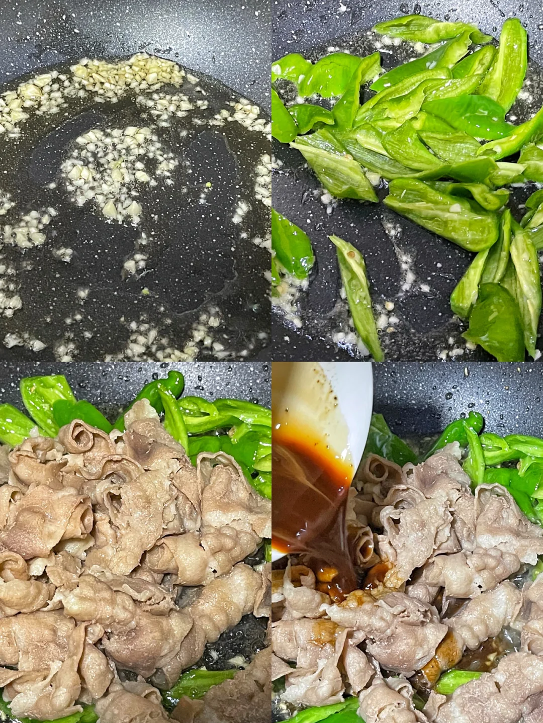 3️⃣锅里热油爆香蒜末下入青椒翻炒1分钟后下入肥牛,然后倒入料汁翻炒到收汁