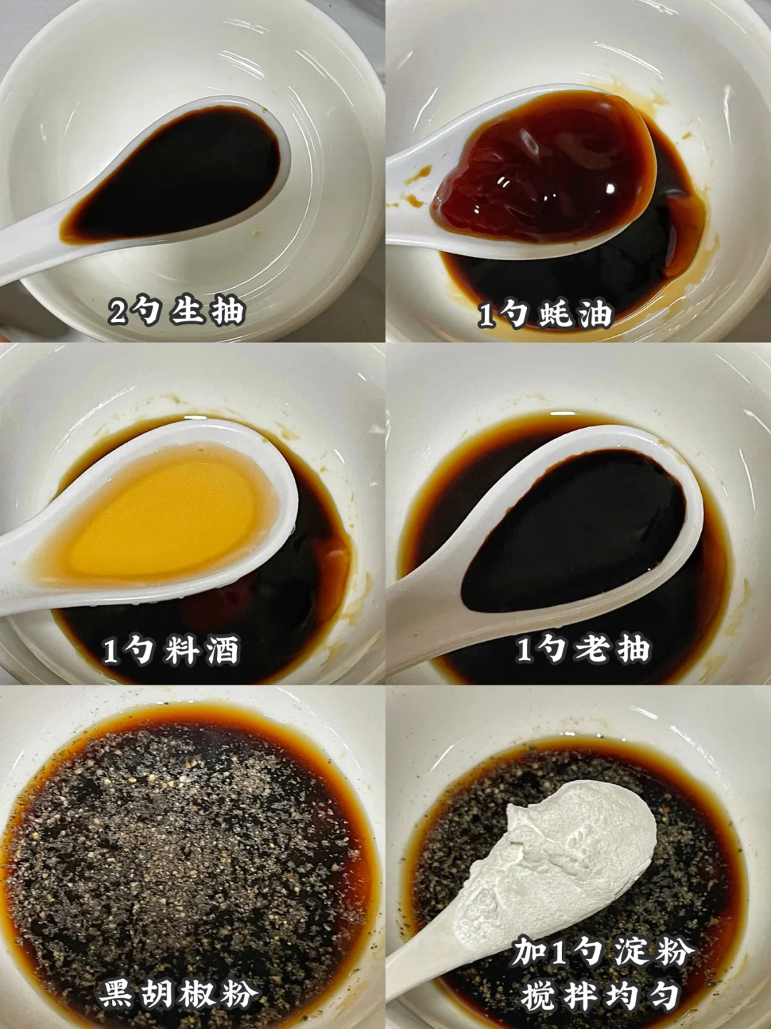 2️⃣调料汁:2勺生抽 1勺蚝油 1勺料酒 1勺老抽 适量黑胡椒粉 1勺淀粉和半碗水搅拌均匀