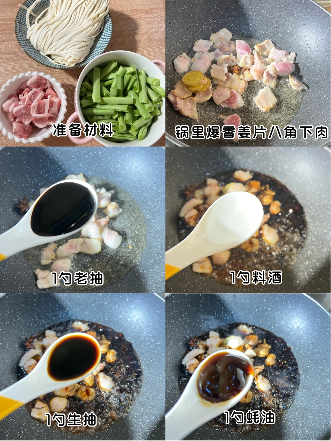 1️⃣豆角掐头去尾掰开,五花肉切片,锅里热油炒香姜片和八角然后下入五花肉片,加1勺生抽,1勺料酒,1勺蚝油,1勺老抽翻炒均匀