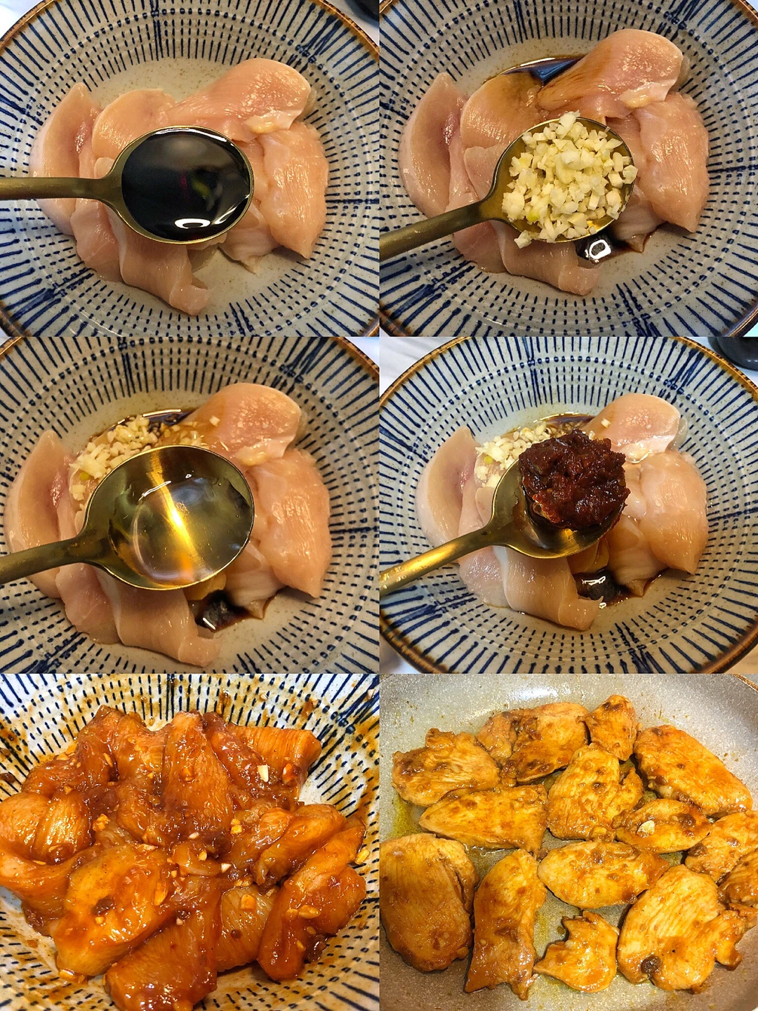 1⃣️鸡胸肉切片加1勺生抽 1勺蒜末 1勺料酒 1勺韩式辣酱腌制30分钟(喜欢甜口的饱饱们还可以加一点蜂蜜哦)
