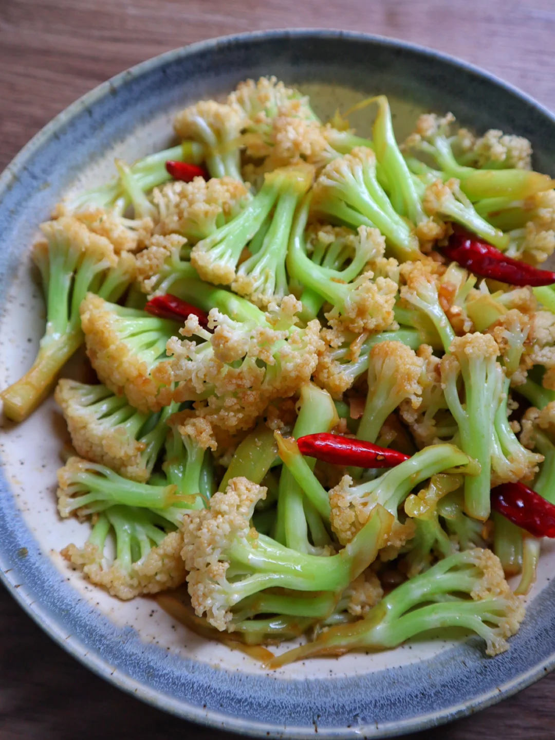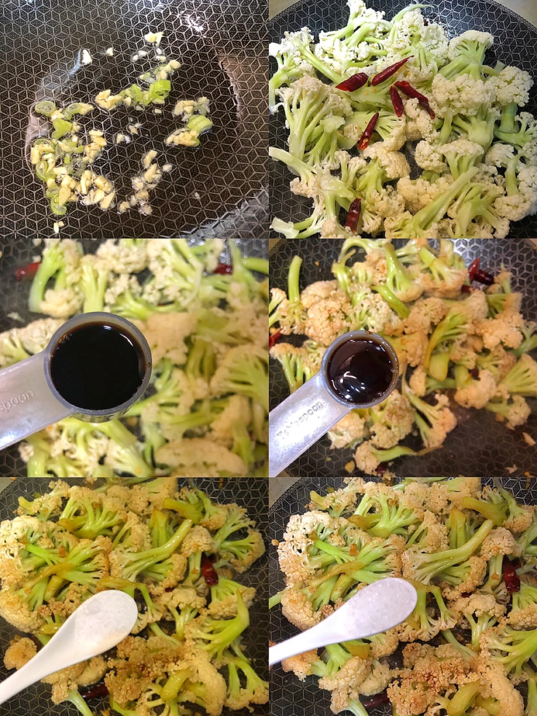 2️⃣锅里热油爆香蒜末后加入菜花和干辣椒翻炒