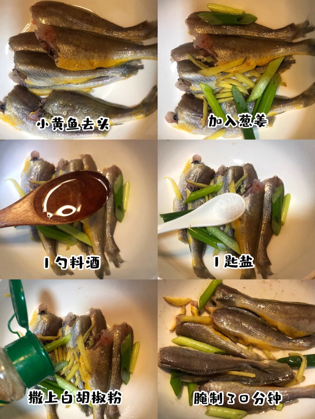 1⃣️小黄鱼去头加入葱姜 一勺料酒 一勺盐 白胡椒粉腌制半小时