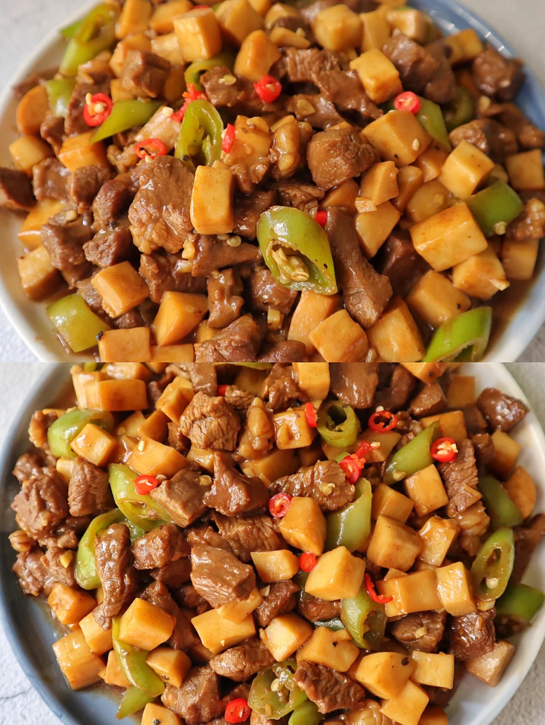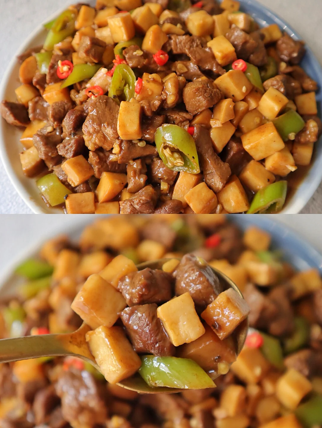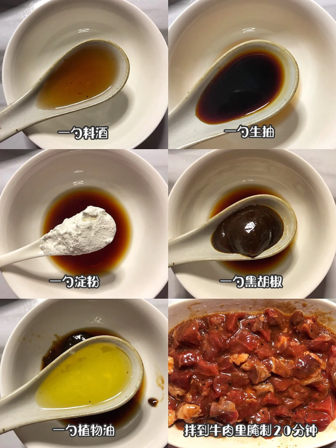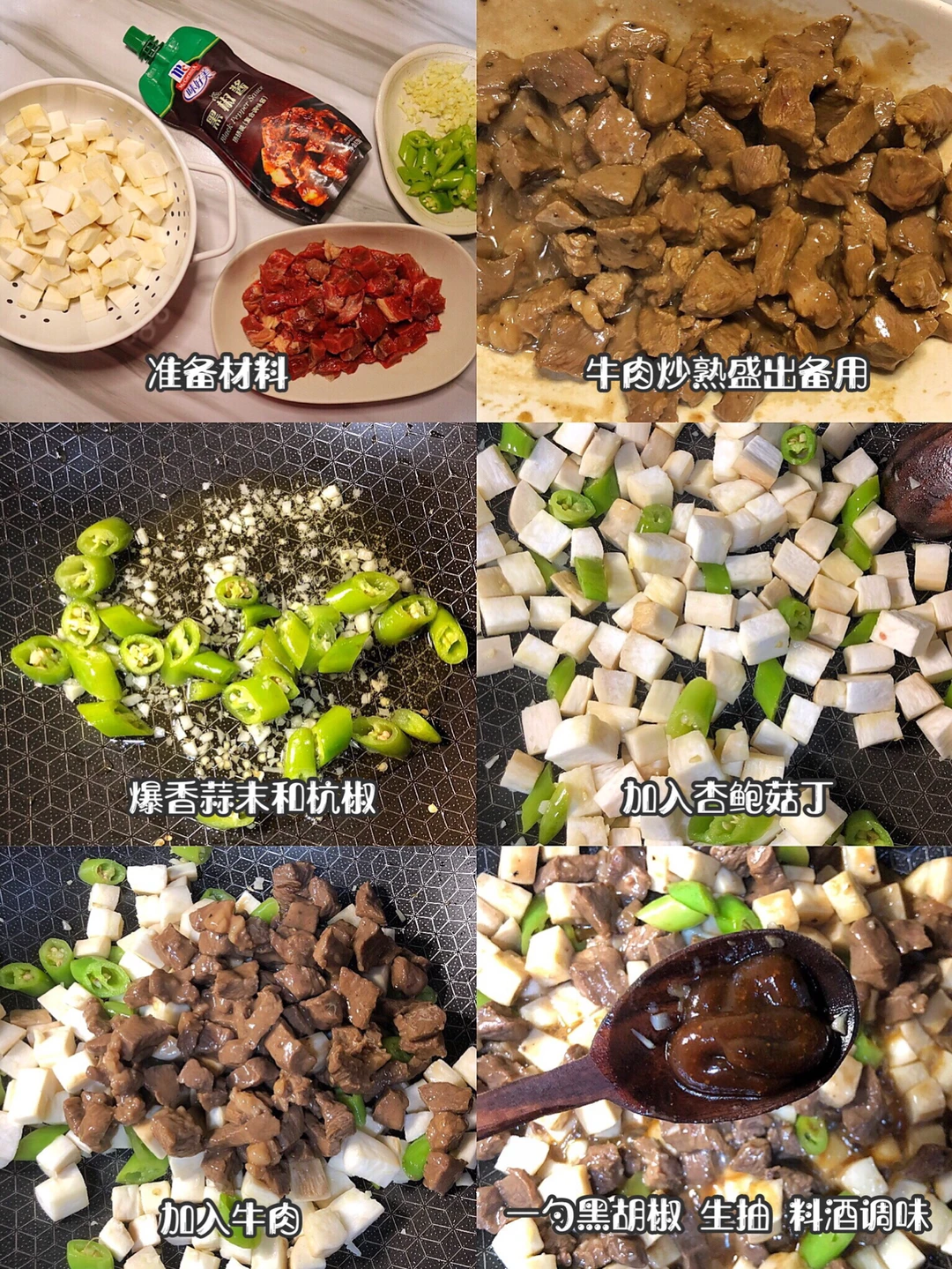 1️⃣牛肉切成粒,杏鲍菇切粒,杭椒切段,牛肉里加一勺生抽 一勺料酒 一勺淀粉 一勺黑胡椒 一勺植物油搅拌均匀,这样可以让牛肉更嫩更入味哦~