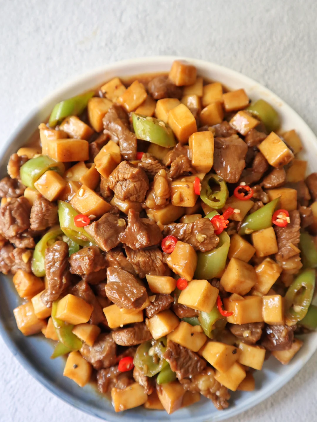 2️⃣牛肉炒熟盛出备用,锅里爆香蒜末和杭椒,然后加入杏鲍菇丁翻炒到变色,加入牛肉粒翻炒均匀
