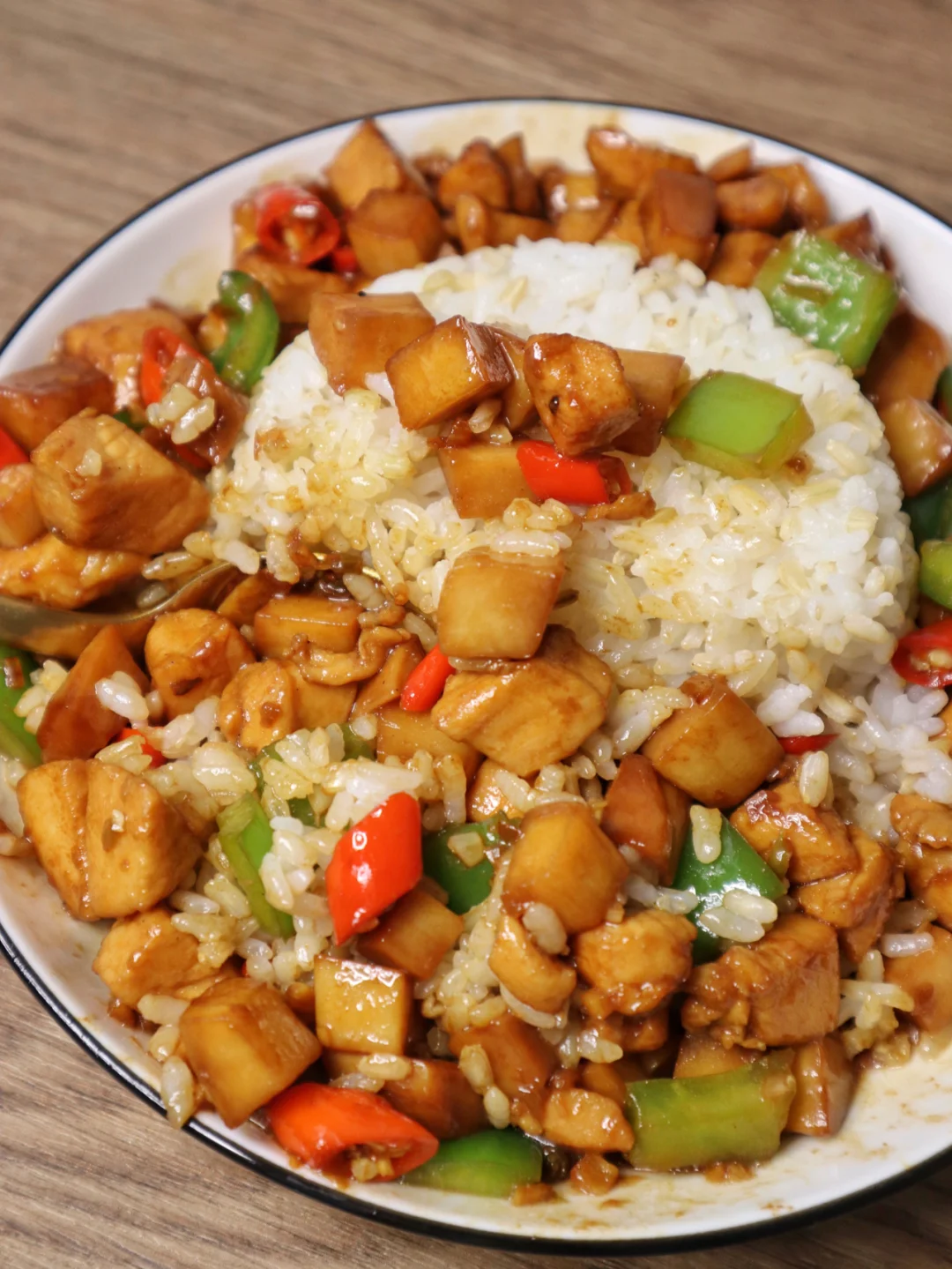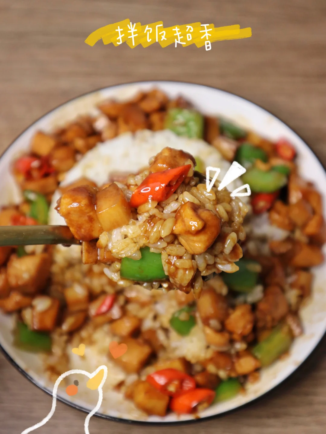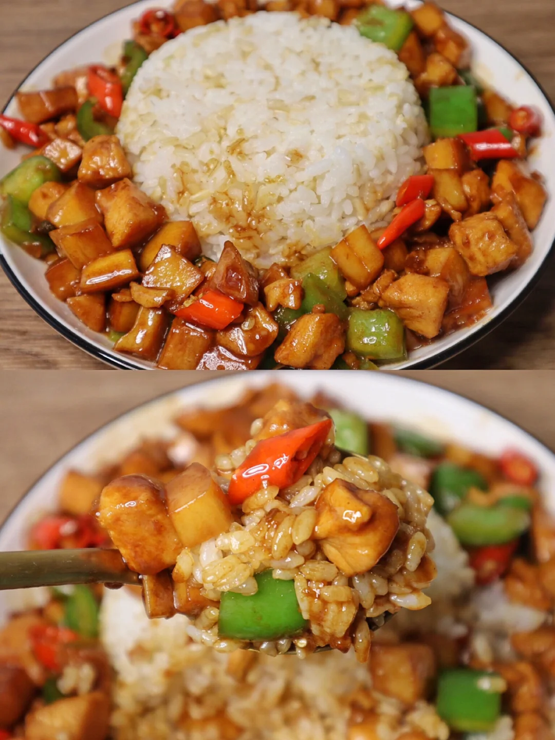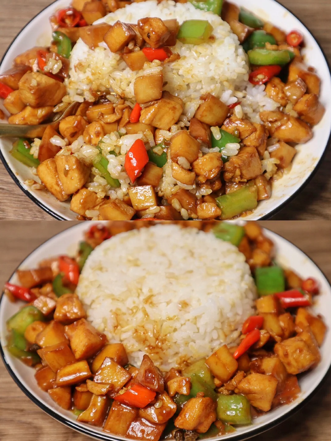 宅在家里怎么能少了拌饭呢,这个杏鲍菇鸡丁拌饭香香辣辣的超好吃哦~