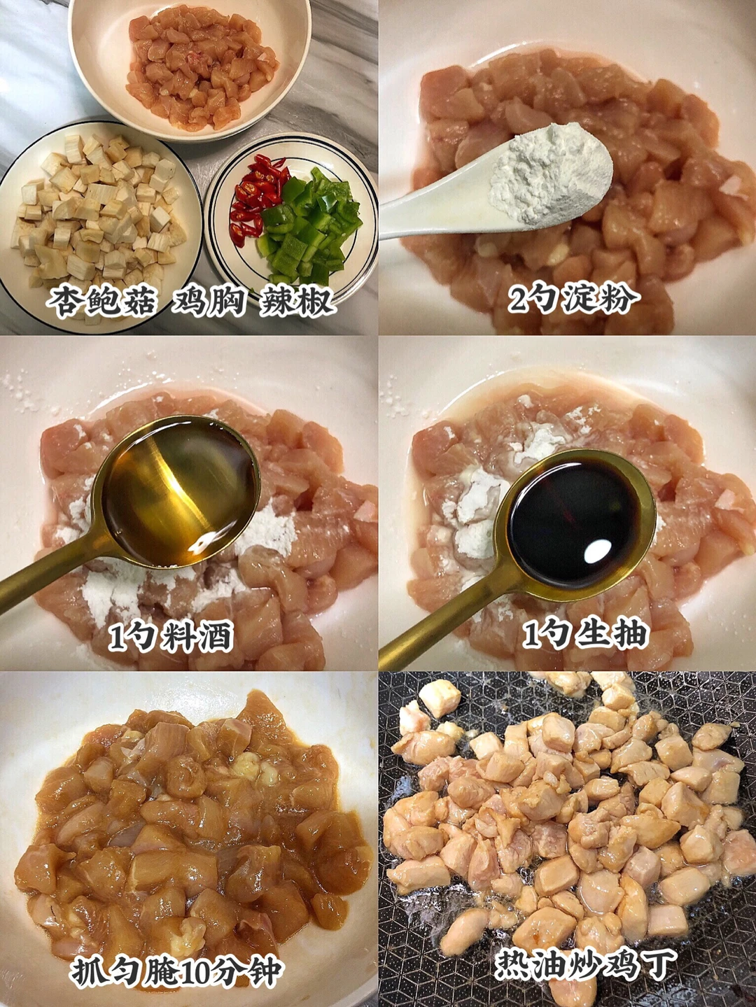 鸡胸肉200g切丁,杏鲍菇一根切丁,青红辣椒切断