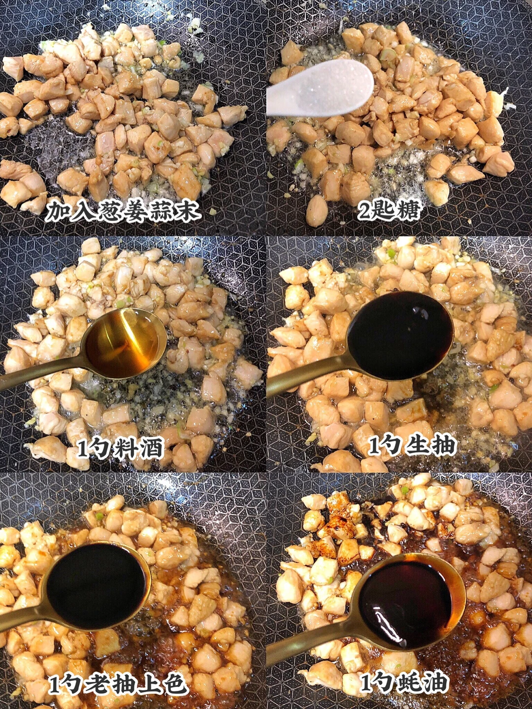 2️⃣热锅热油加入鸡丁翻炒到变色,然后加入葱姜蒜末,加入两勺糖,一勺生抽,一勺料酒,一勺蚝油,一勺老抽翻炒均匀