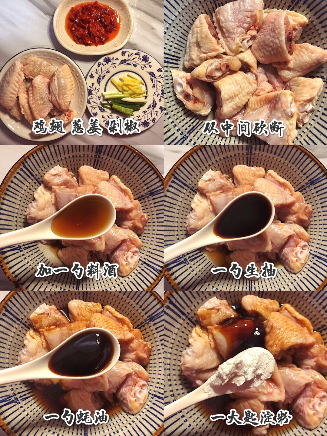 1️⃣鸡翅从中间砍断,加一勺料酒,一勺生抽,一勺蚝油,一大匙淀粉加入吵架抓拌均匀腌制30分钟