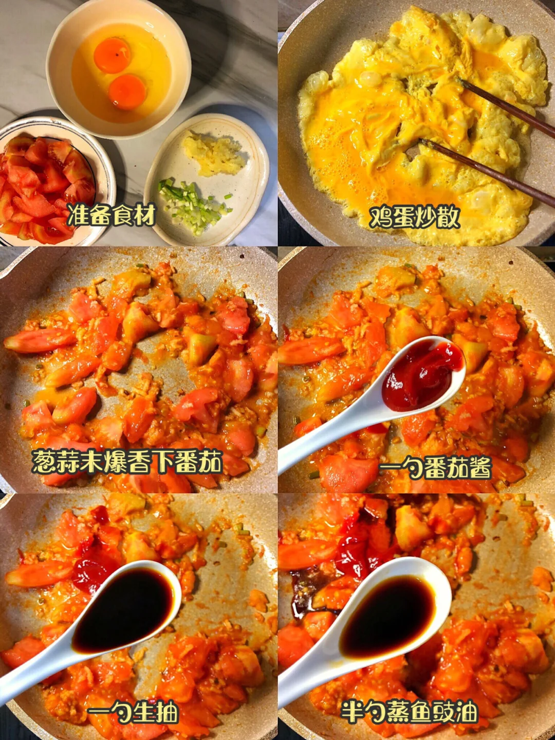 2️⃣锅里热油(也尽量用猪油👏🏻)爆香葱蒜末后下番茄炒到软烂,加入一勺番茄酱,一勺生抽和半勺蒸鱼豉油,然后加入一勺盐,一勺糖调味儿,喜欢甜口的就多放一点糖,然后加入半碗水煮沸