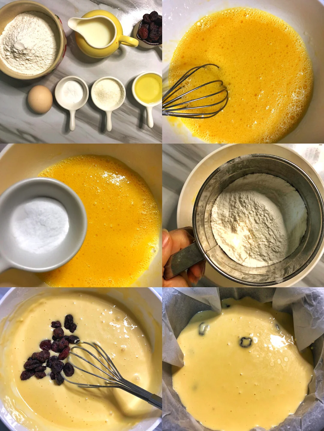 2️⃣加入蔓越莓搅拌均匀,倒入蛋糕模具,烤箱180度预热5分钟然后180度再烤30分钟