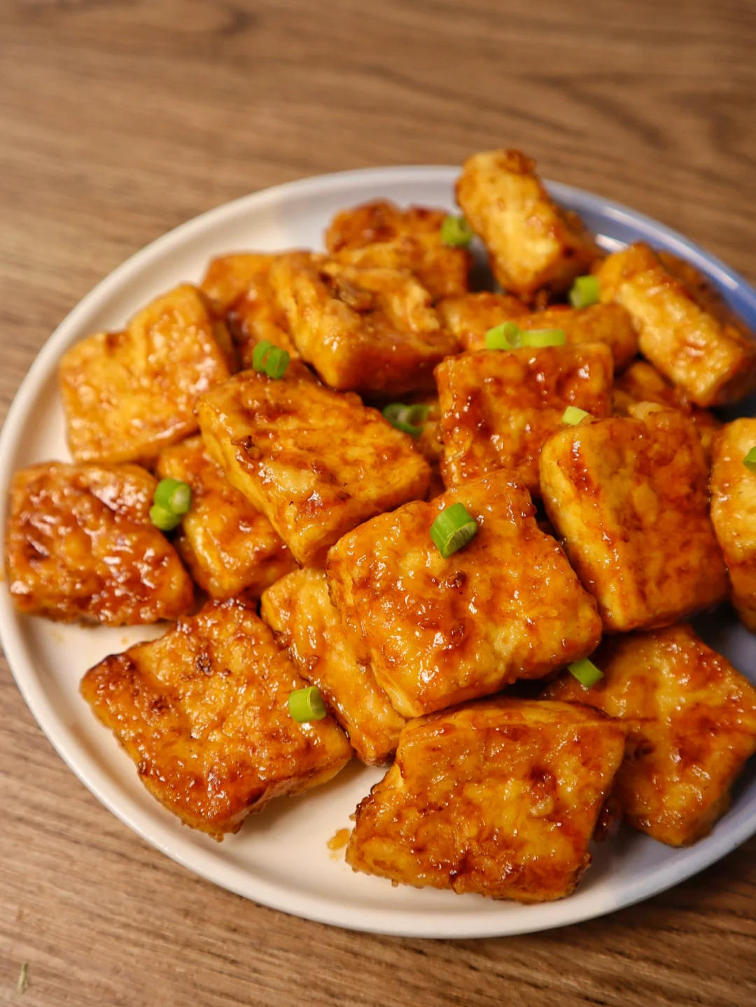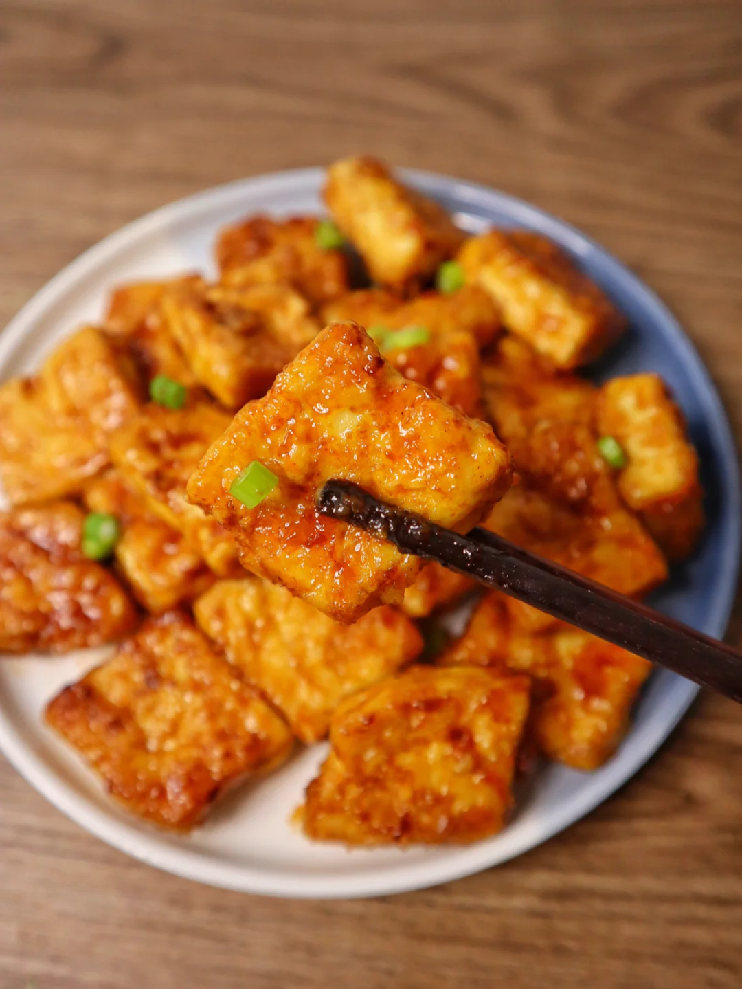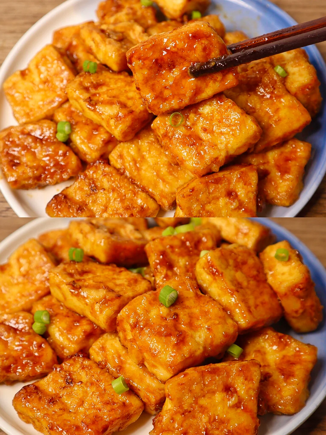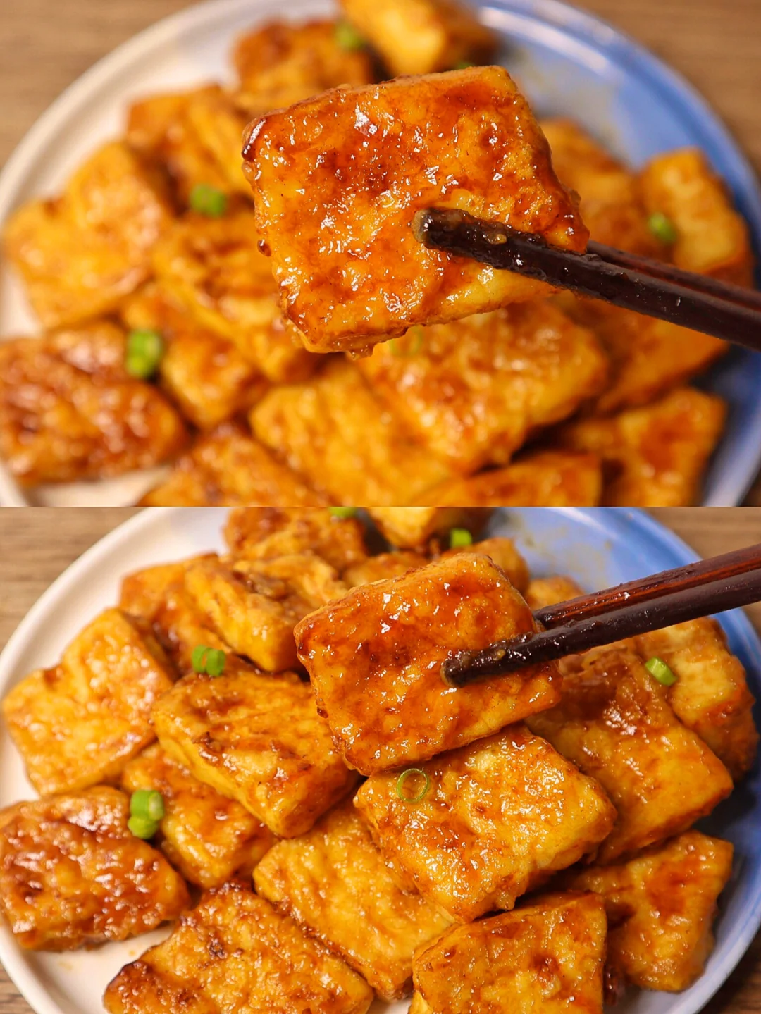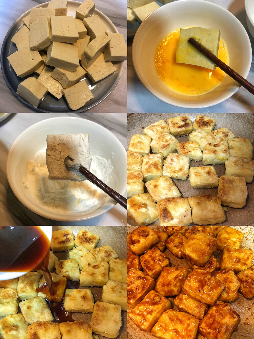 ❷豆腐切成块,然后过上一层蛋液再过上一层淀粉小火煎到双面金黄倒入酱汁,迅速翻炒收汁
