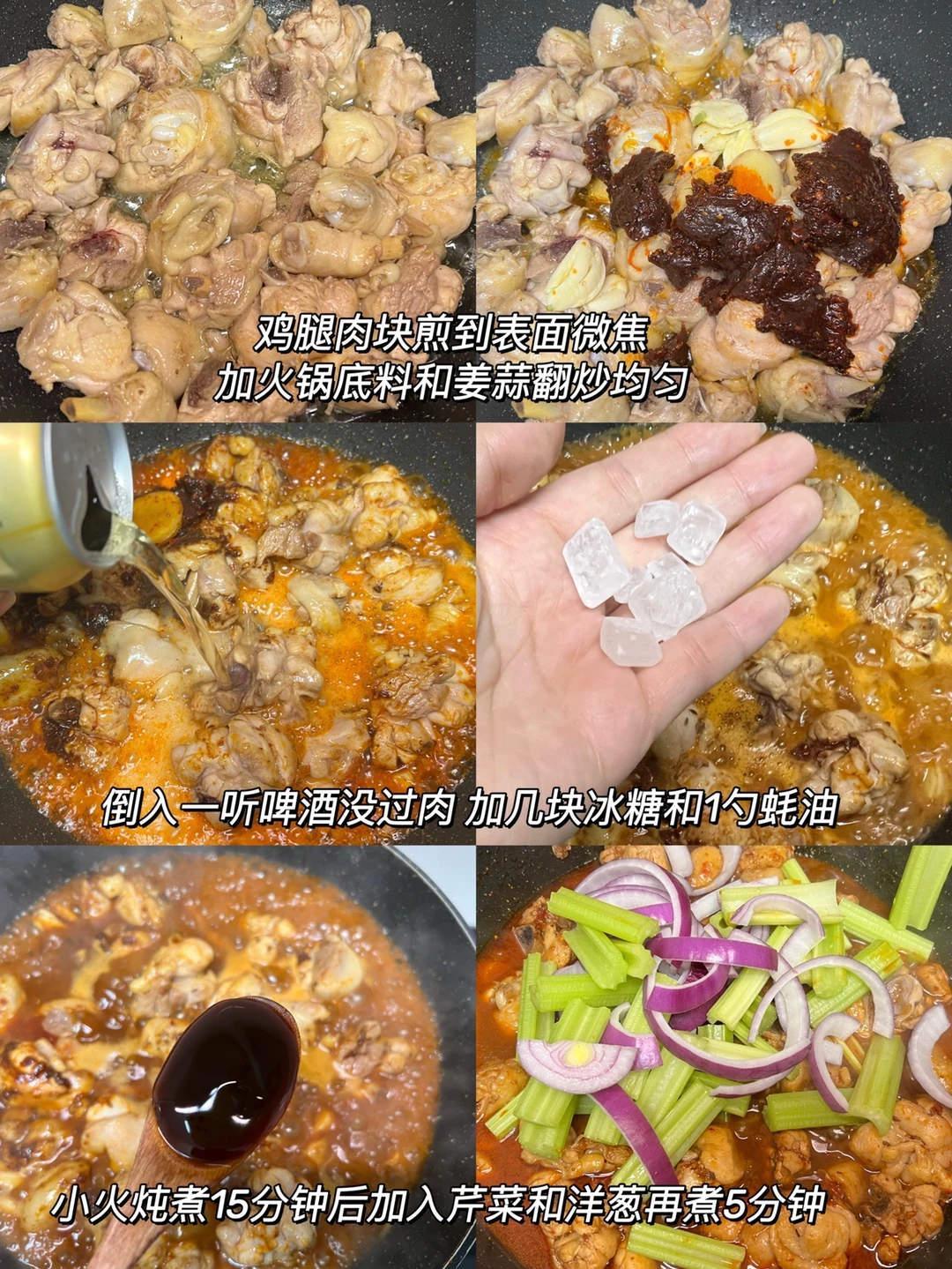 2️⃣倒入啤酒没过鸡腿,加1勺蚝油和几块冰糖提鲜,中小火盖盖子煮15分钟后倒入芹菜和洋葱再煮5分钟就好啦