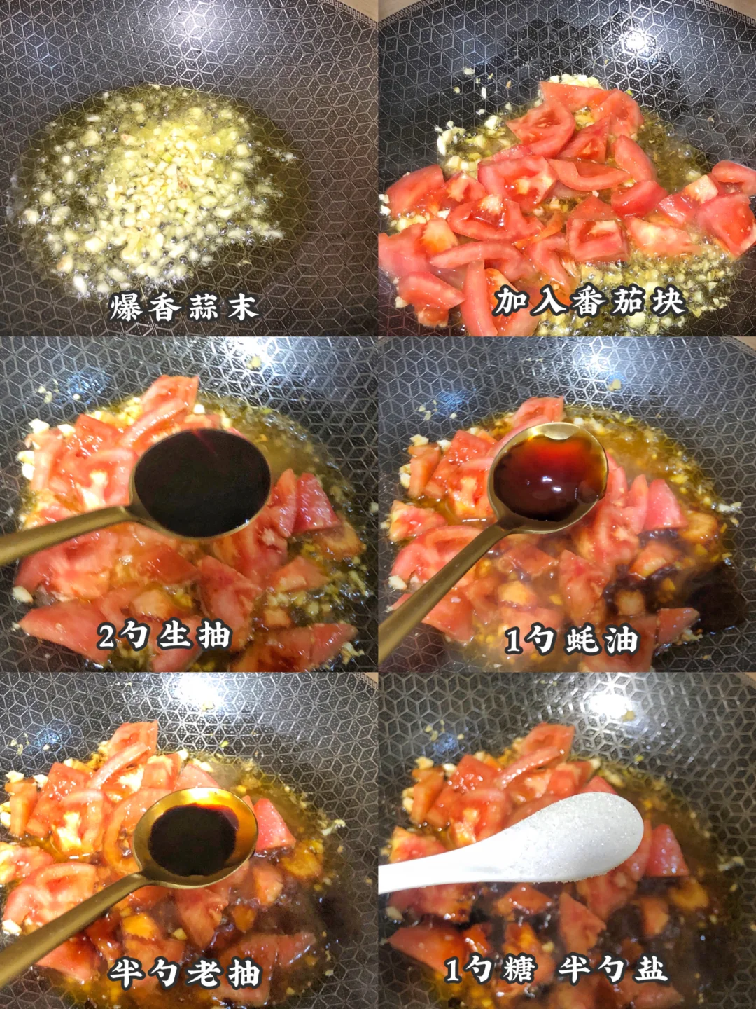 2️⃣爆香蒜末加入番茄 2勺生抽 1勺蚝油 半勺老抽 1勺盐和半勺糖,把番茄炒到软烂
