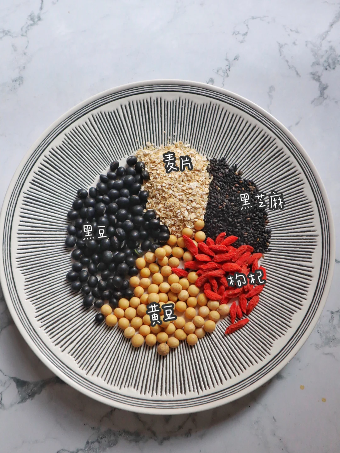枸杞 黄豆 黑豆 燕麦 黑芝麻,有种淡淡的黑芝麻糊的味道,我喜欢加糖或者蜂蜜