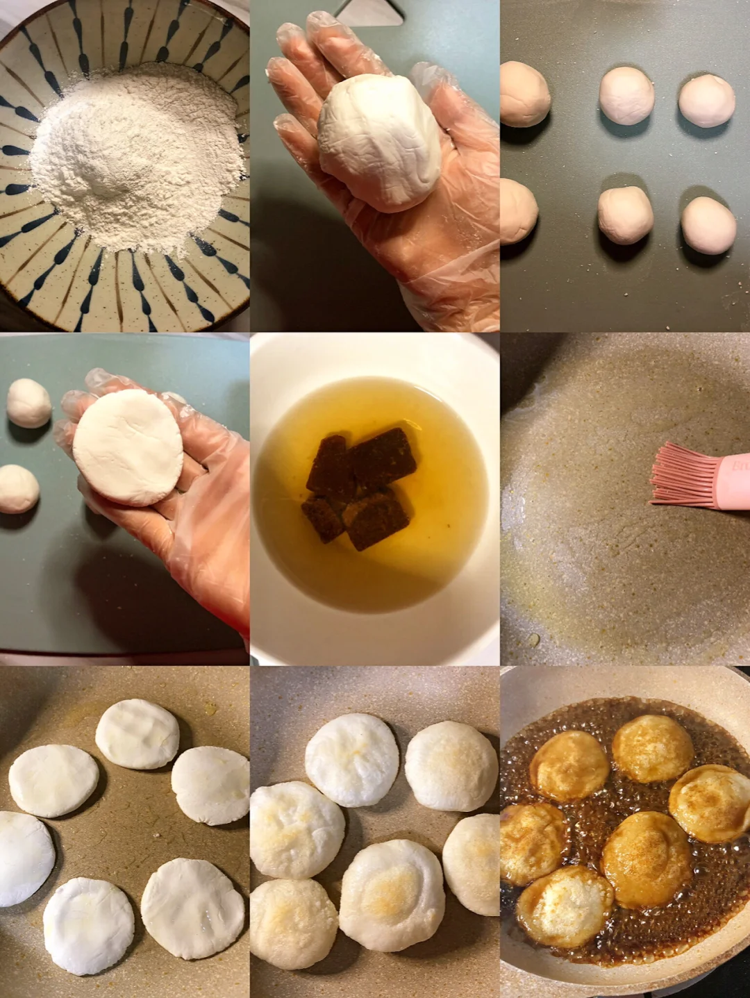 2️⃣红糖加50g热水化开备用,锅里刷一层薄油,小火煎面饼,煎到微微鼓起双面金黄