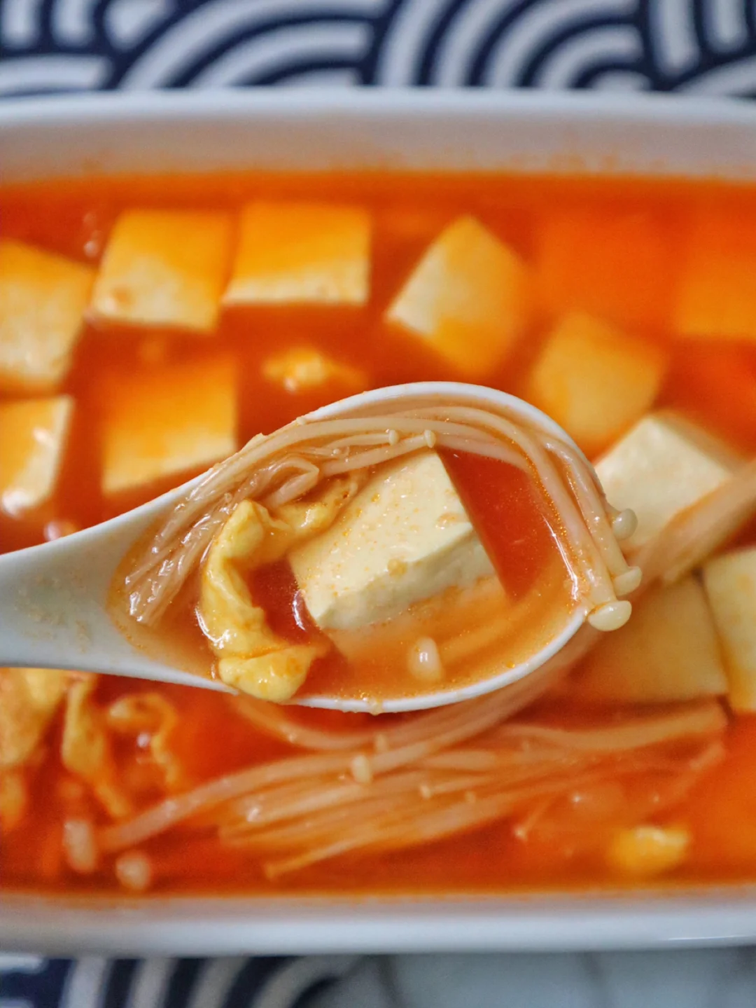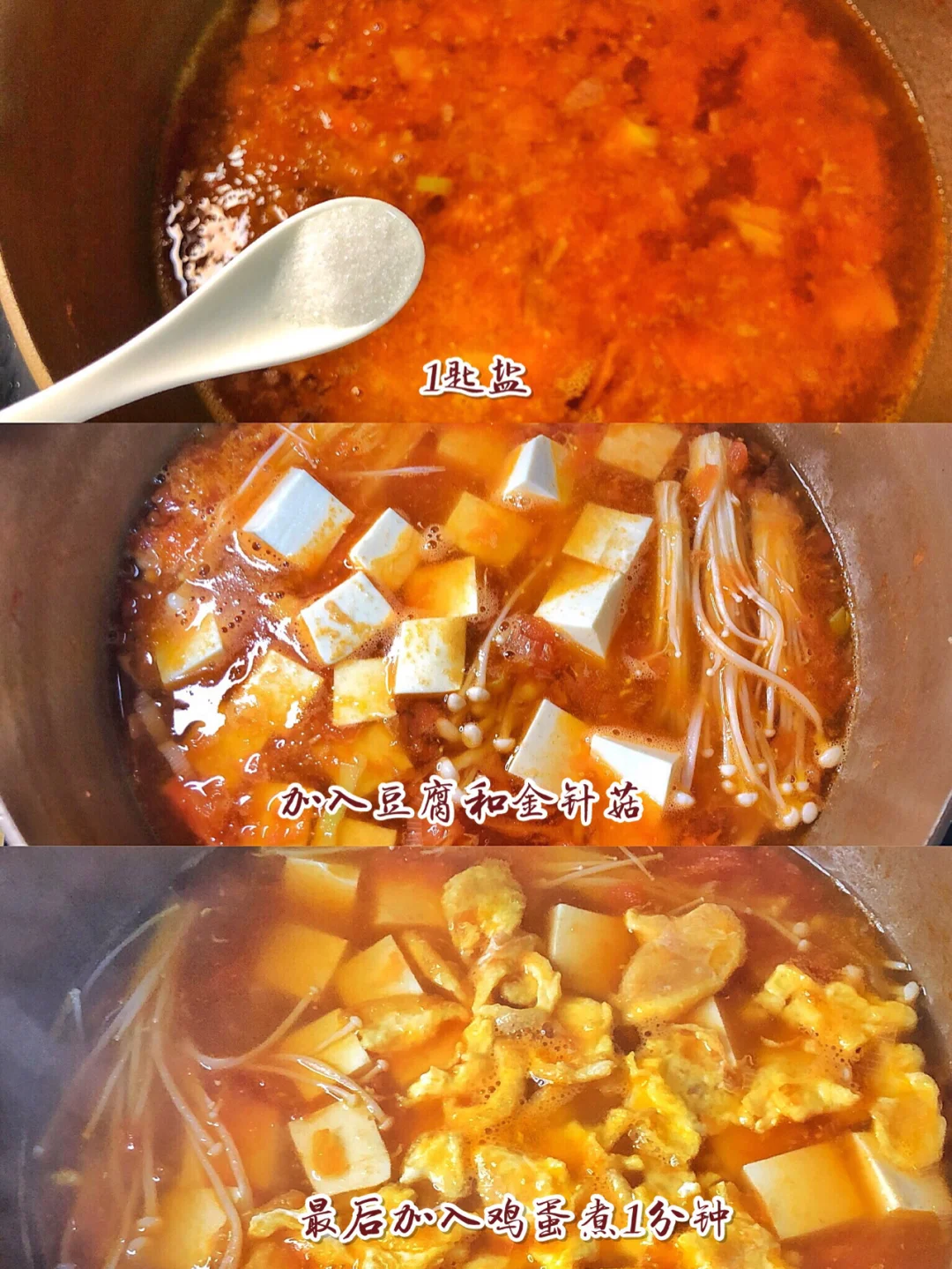 3️⃣加入豆腐和金针菇煮沸后加鸡蛋,再煮一分钟就可以喝啦~