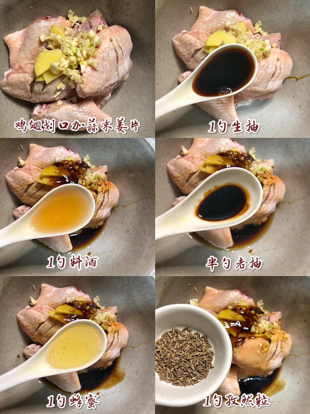 1️⃣鸡翅洗净双面划上刀口方便入味,加入3瓣蒜的蒜泥,4片姜,加入1勺生抽 1勺料酒 半勺老抽 一勺蜂蜜 一大勺孜然粉和半匙盐抓拌均匀腌制2小时以上
