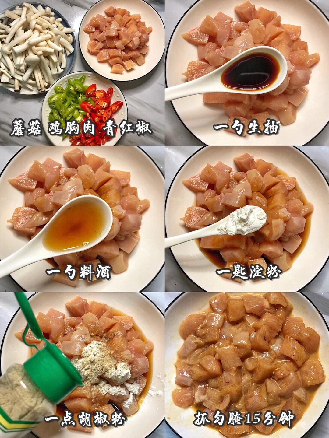 1️⃣蟹味菇和白玉菇清洗干净掰开,鸡胸肉切成小丁青,红辣椒切成辣椒圈