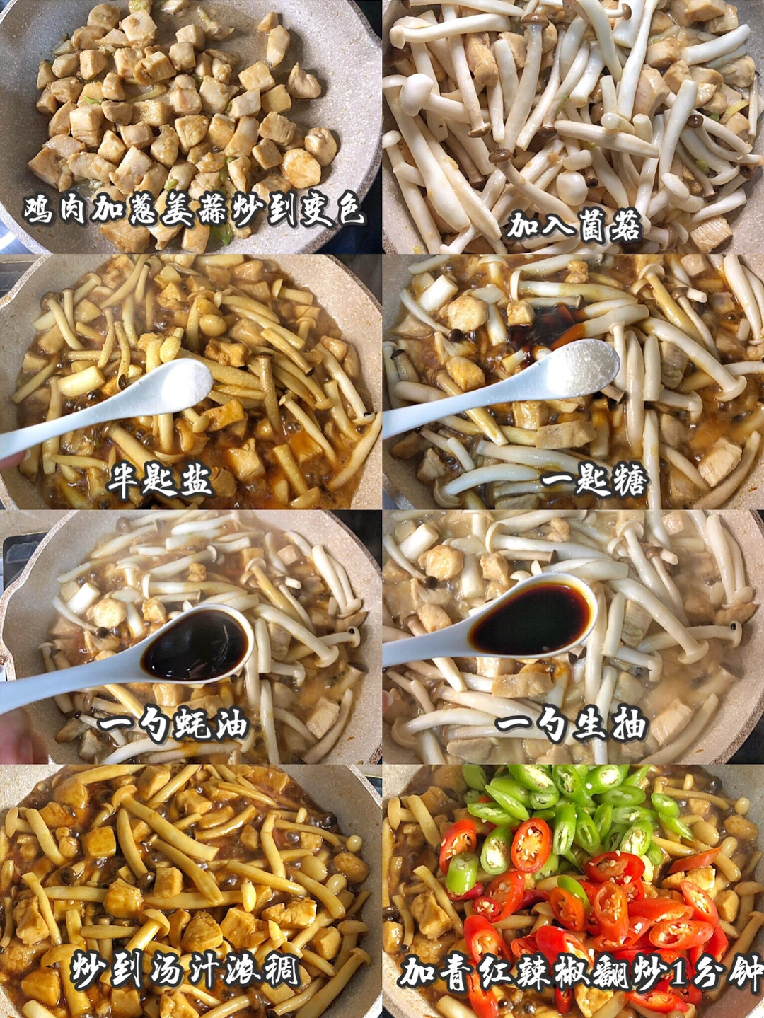 3️⃣锅里热油加入鸡胸肉和葱姜蒜翻炒到鸡胸肉变色,然后加入菌菇再加半匙盐和一匙糖,一勺蚝油,一勺生抽和半勺老抽调味,等汤汁炒到粘浓稠以后加入青红辣椒圈翻炒一分钟